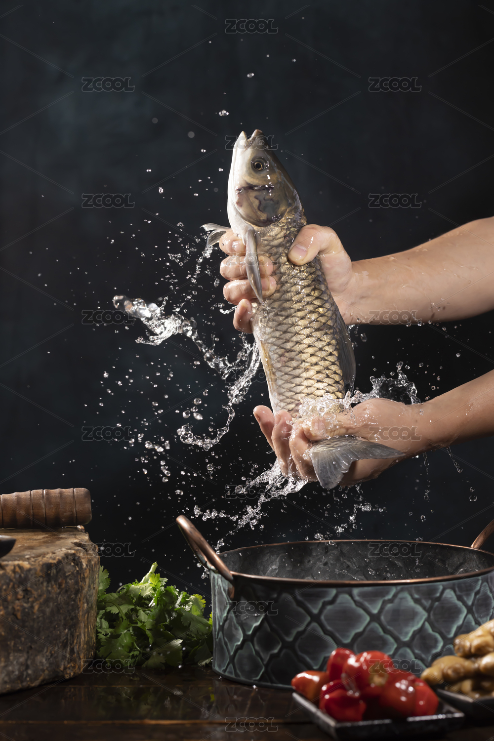 雙手正在撈起準備宰殺的新鮮活魚草魚