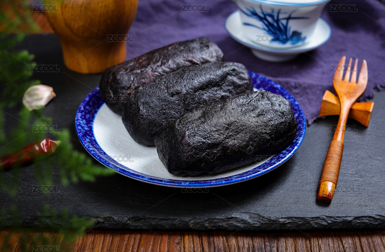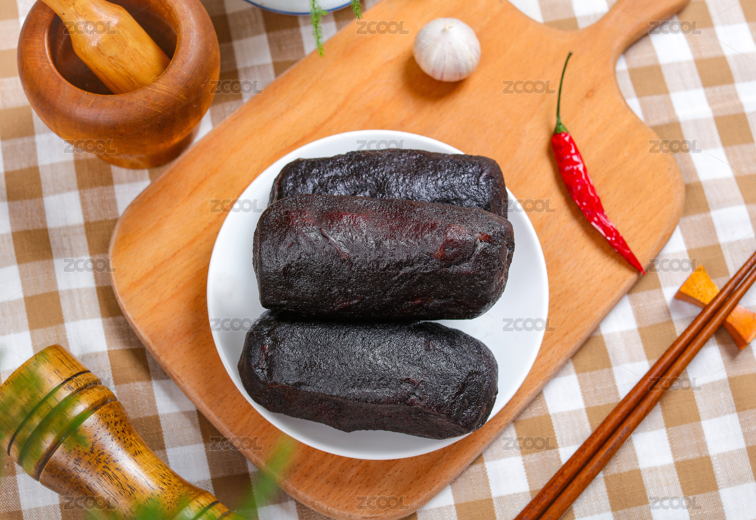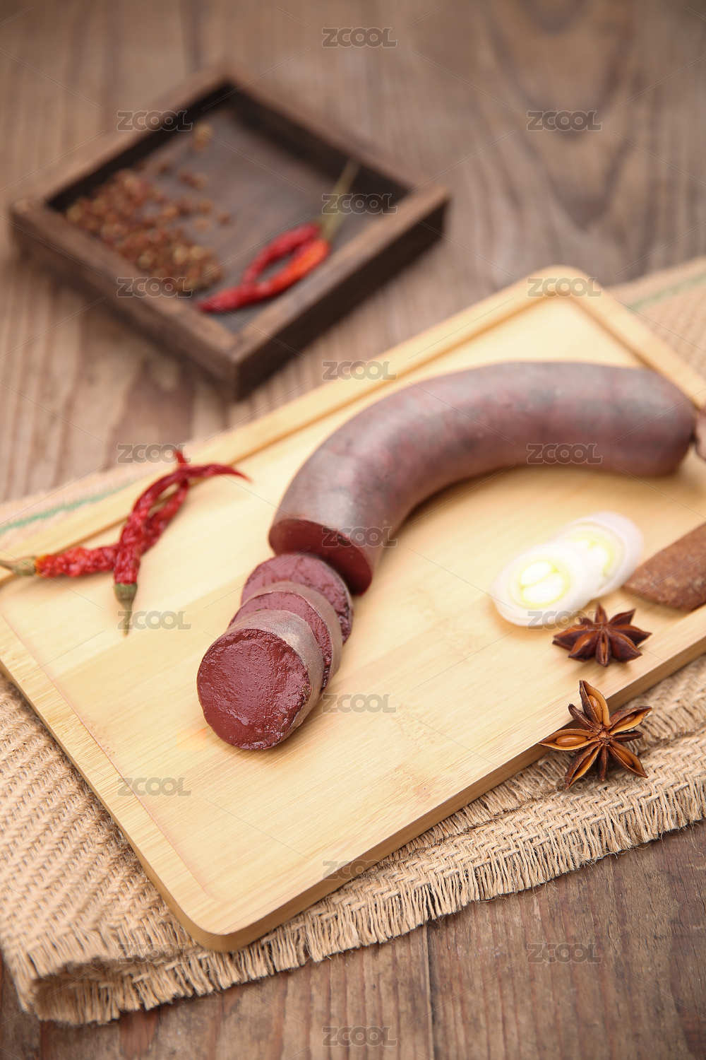盛裝血腸的木托盤和香辛料放在木桌上