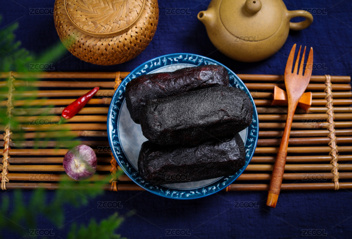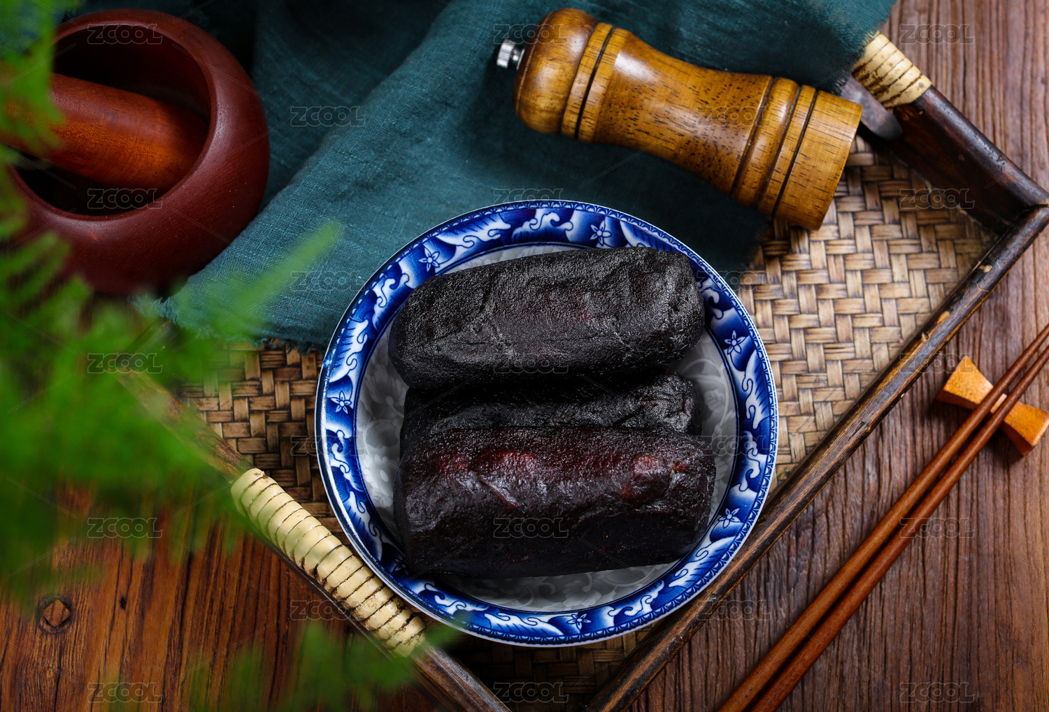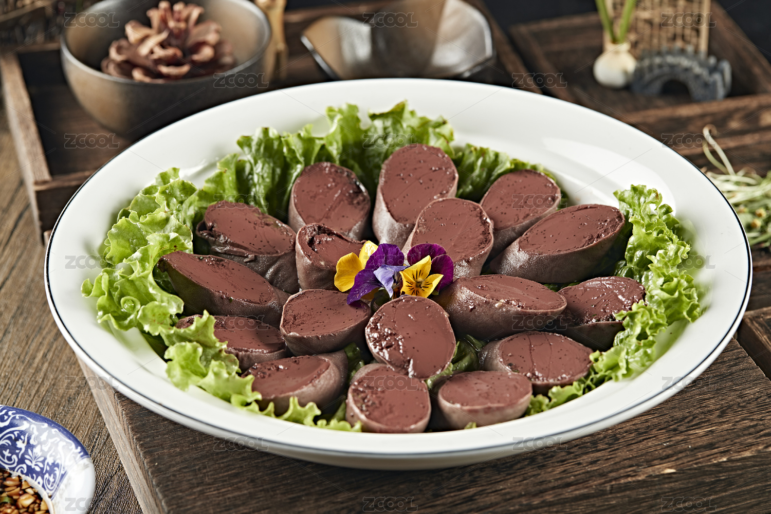 盛裝血腸的木托盤和香辛料放在木桌上