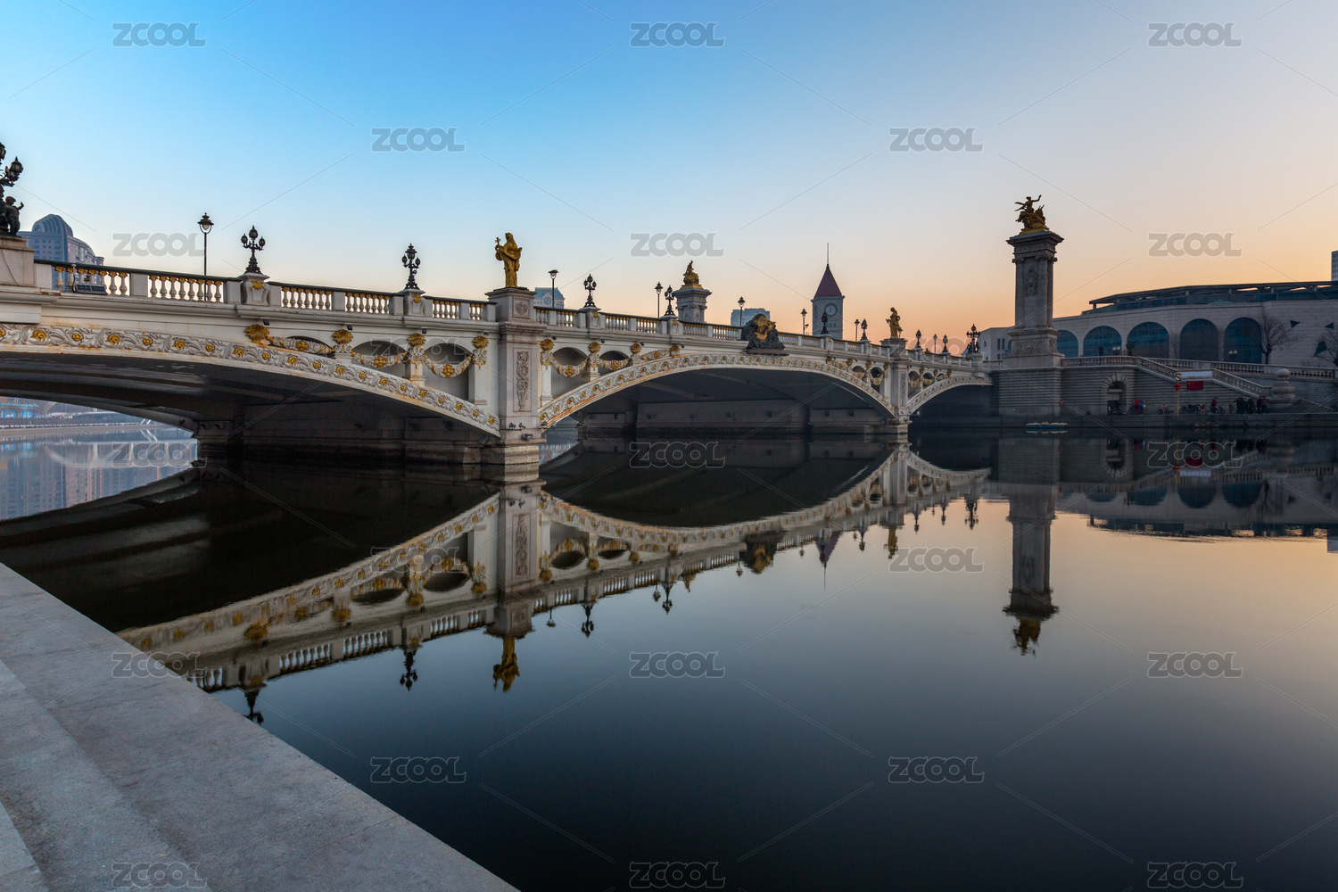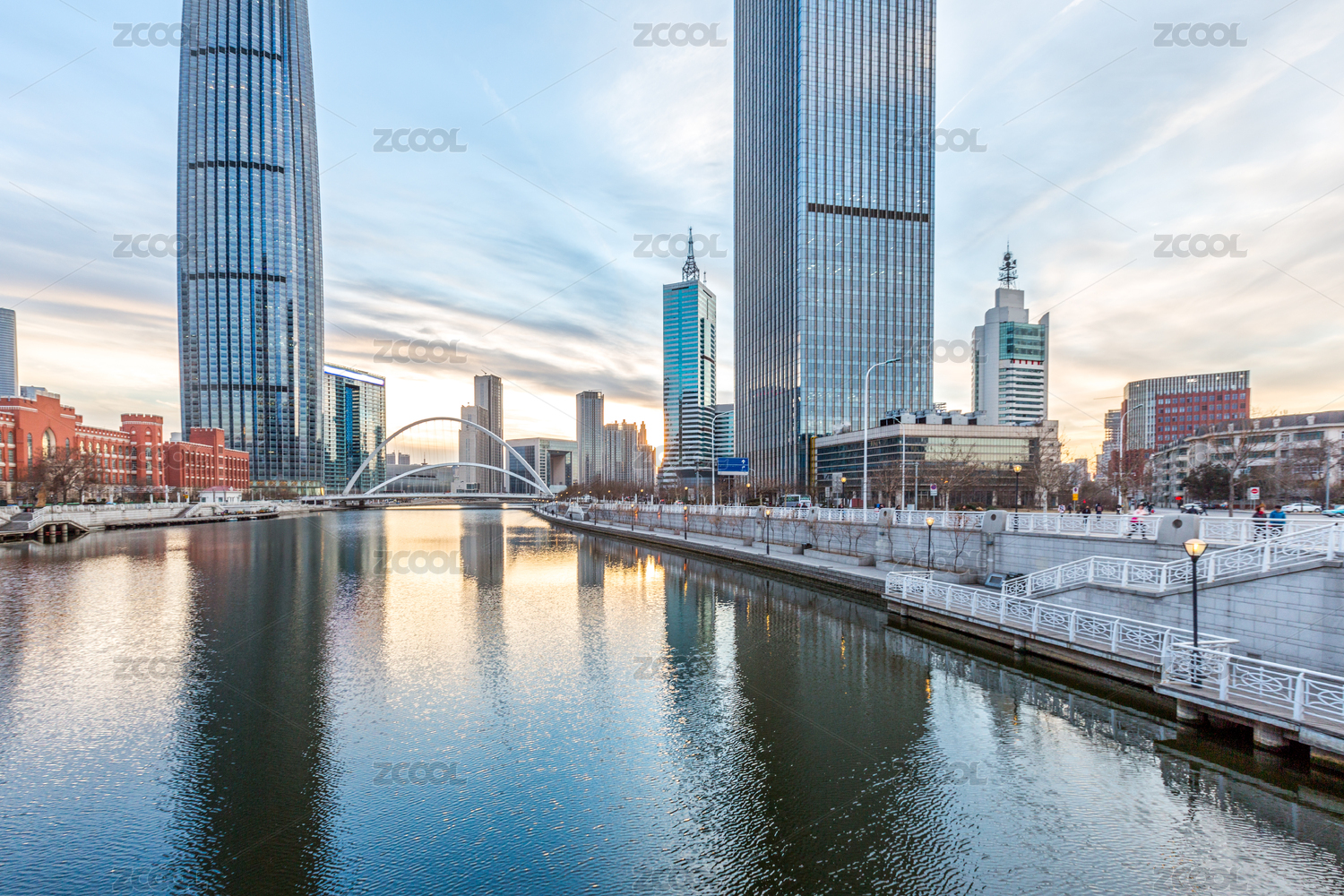 河并在天津,中國現(xiàn)代建筑對天空黃昏。
