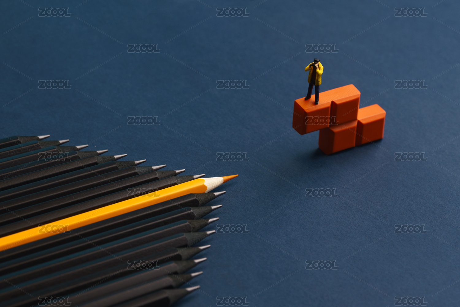 站在積木上觀望遠(yuǎn)處的黃色鉛筆微縮創(chuàng)意圖