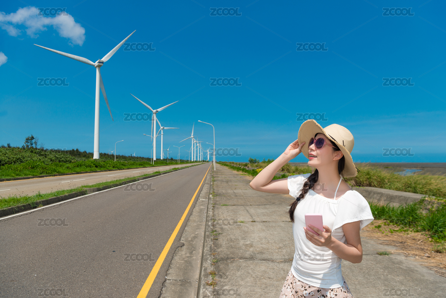 迷人的亞洲女子拿著??智能手機(jī),以尋找旅行度假在線地圖,在背景上的綠色電力風(fēng)車(chē)的方向。