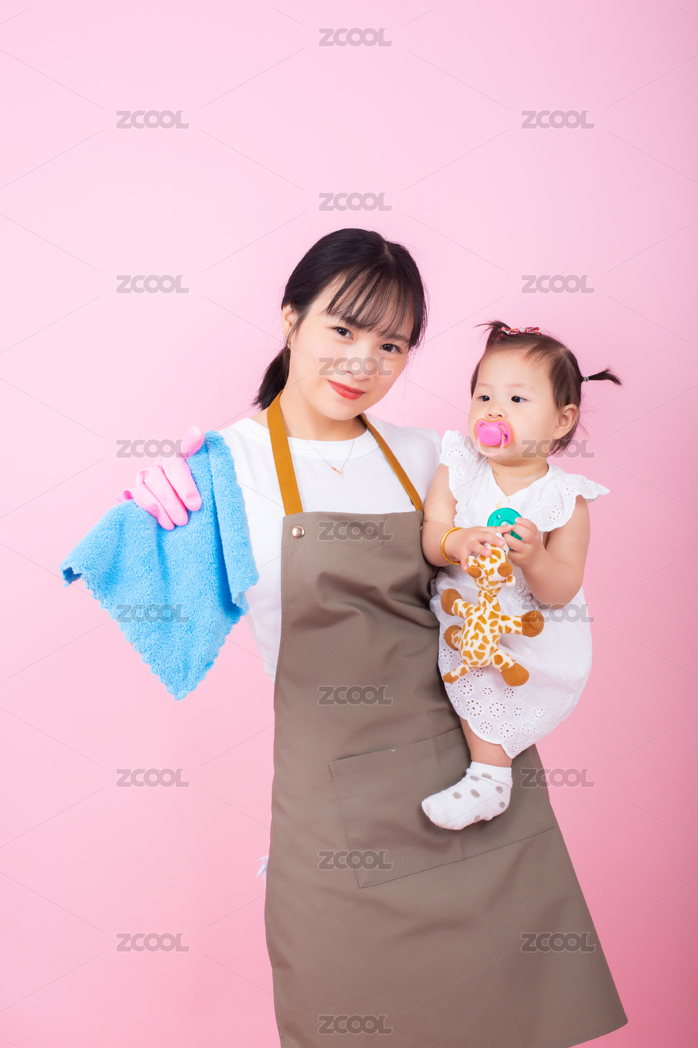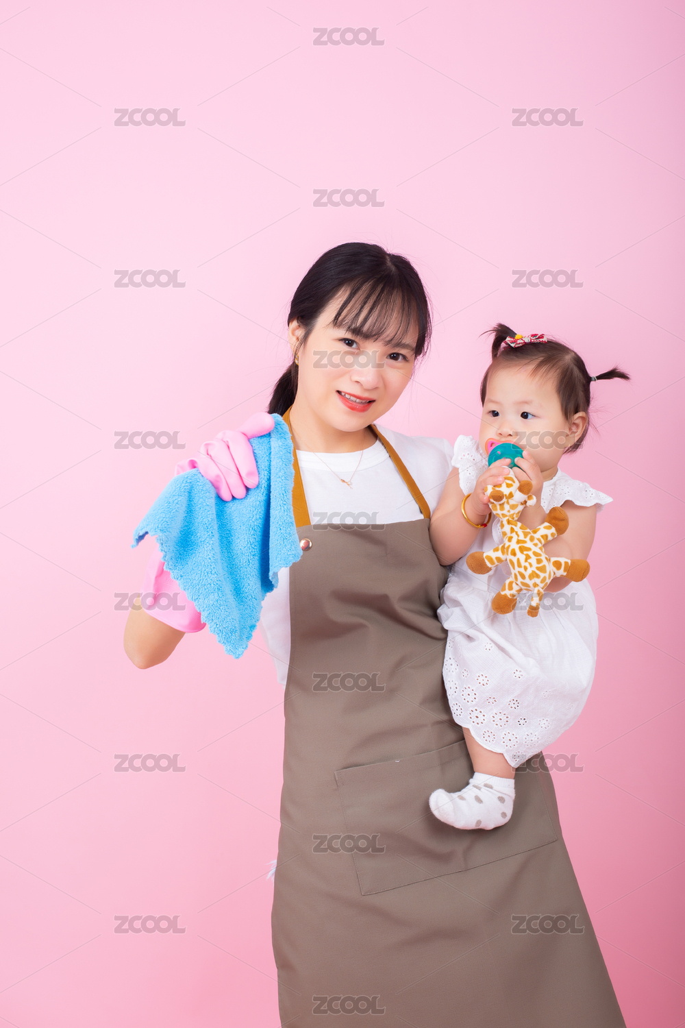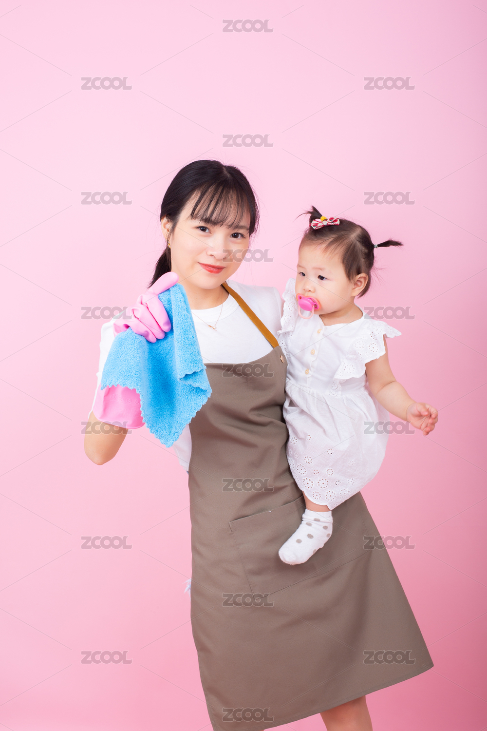 抱著孩子打掃衛(wèi)生的年輕媽媽