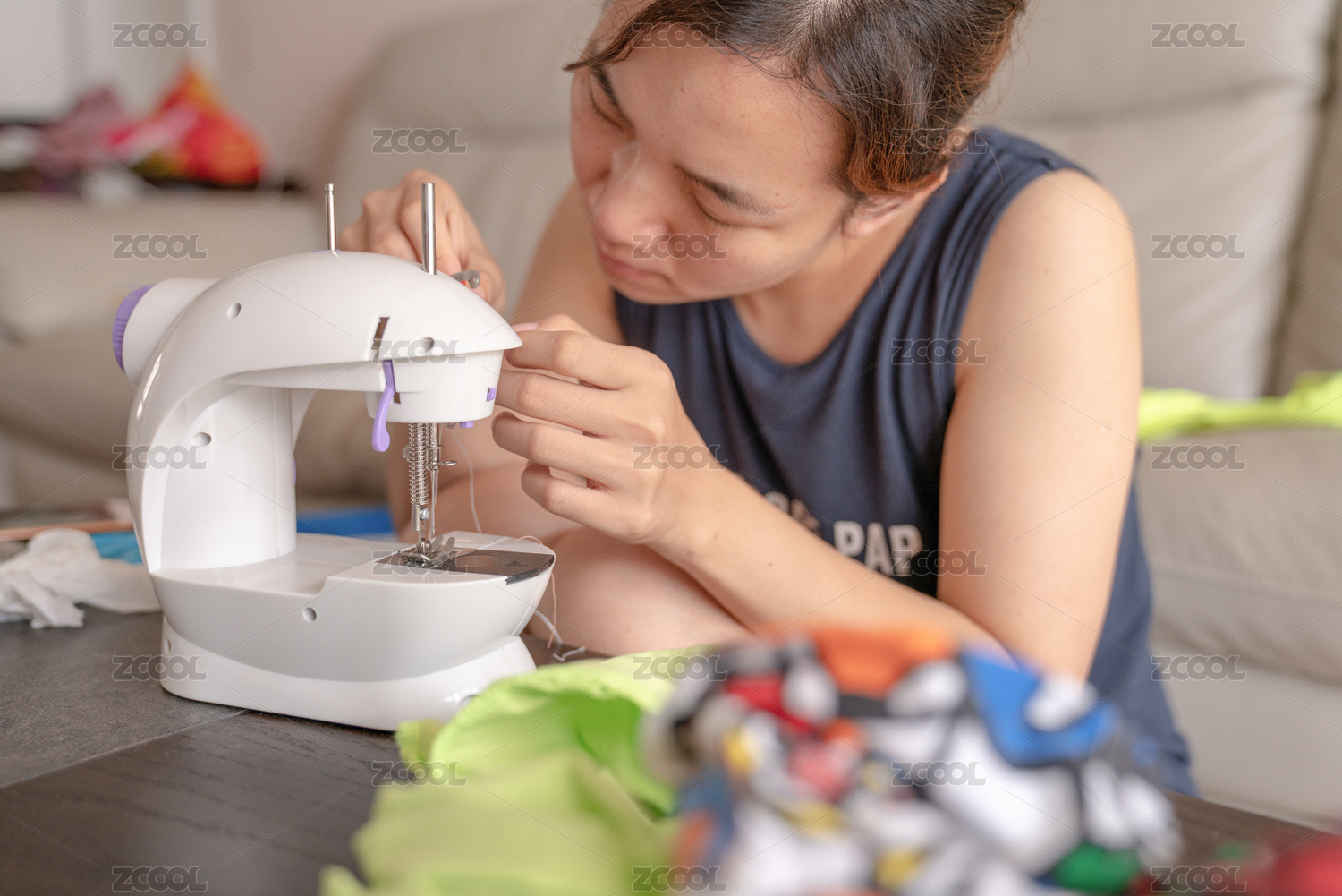 賢惠的年輕女性正在使用小型電動(dòng)縫紉機(jī)制作衣物
