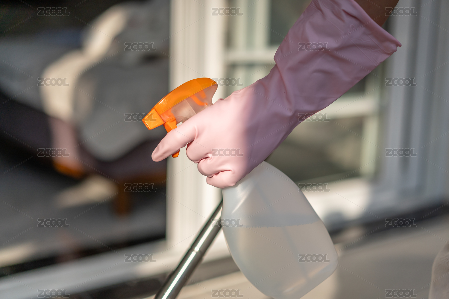 一個(gè)年輕漂亮的亞洲女性做用玻璃清洗雨刮器在客廳家務(wù)的肖像?;煅獊喼薜闹袊J健?/div>