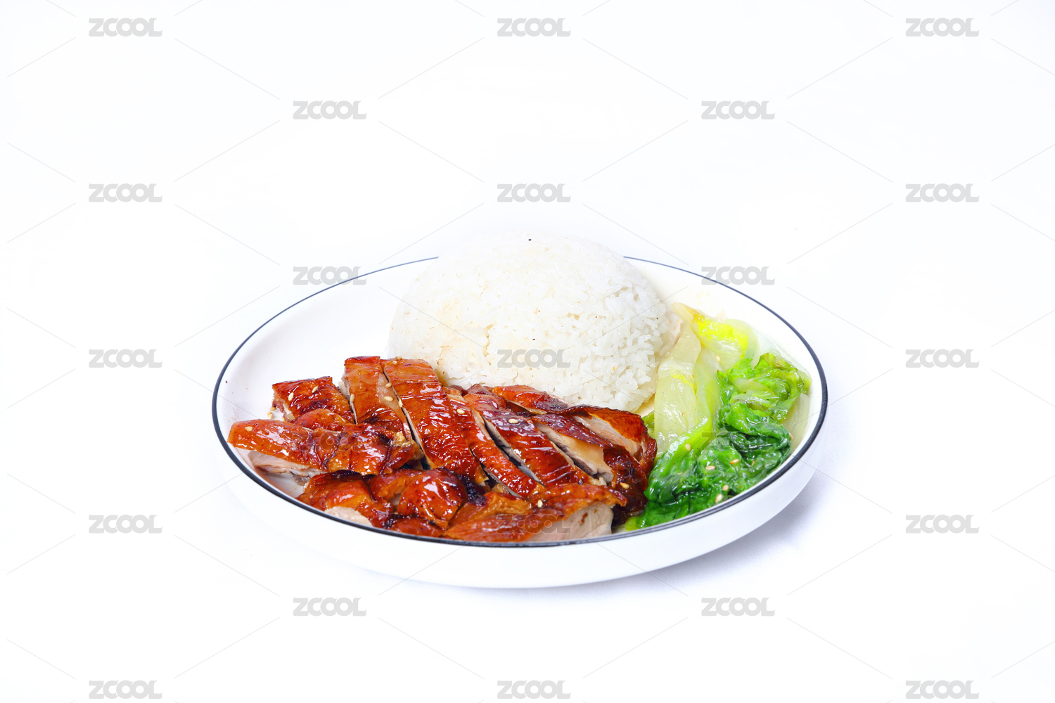 藍(lán)色桌布上的脆皮燒鴨白斬雞雙拼套餐飯便當(dāng)