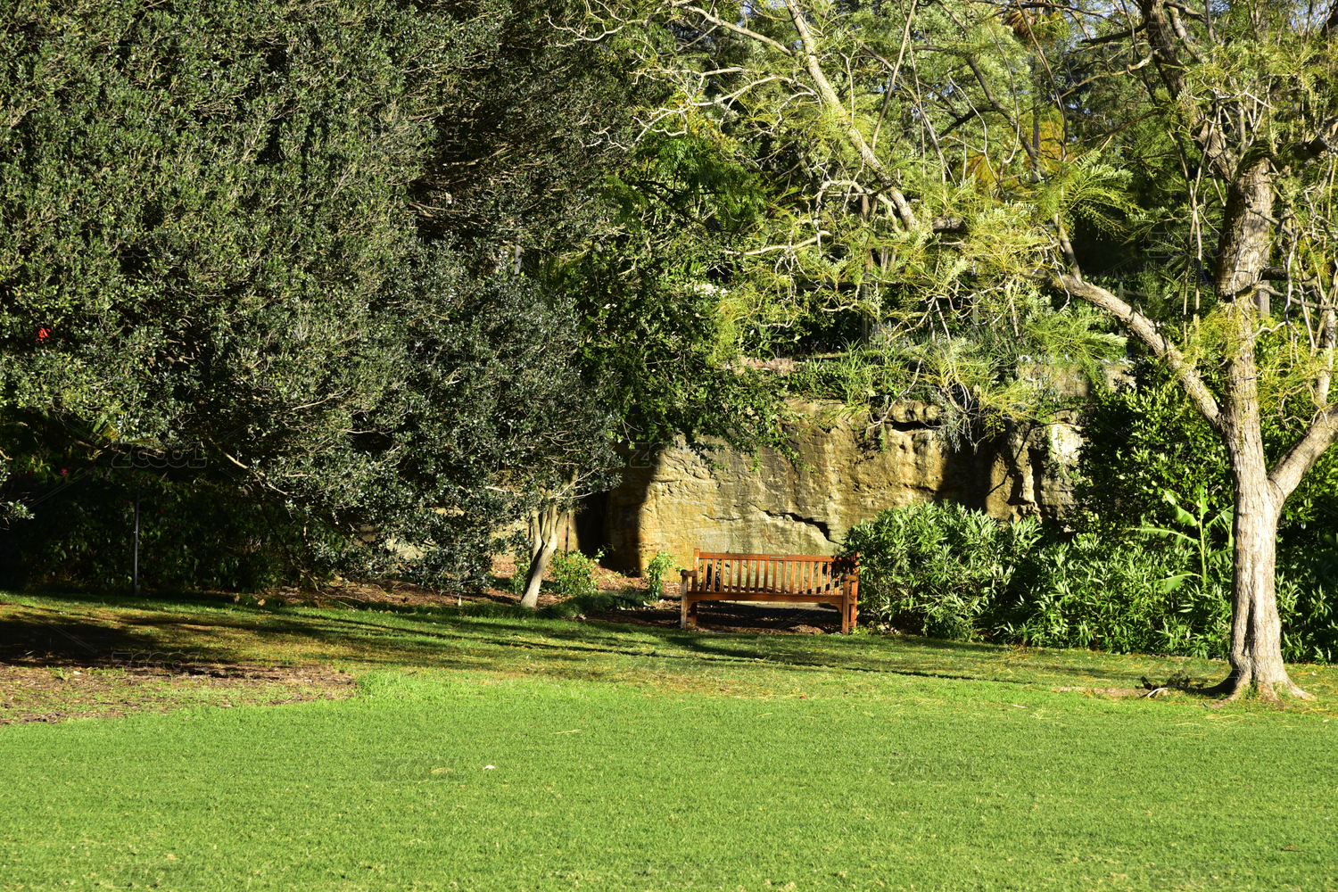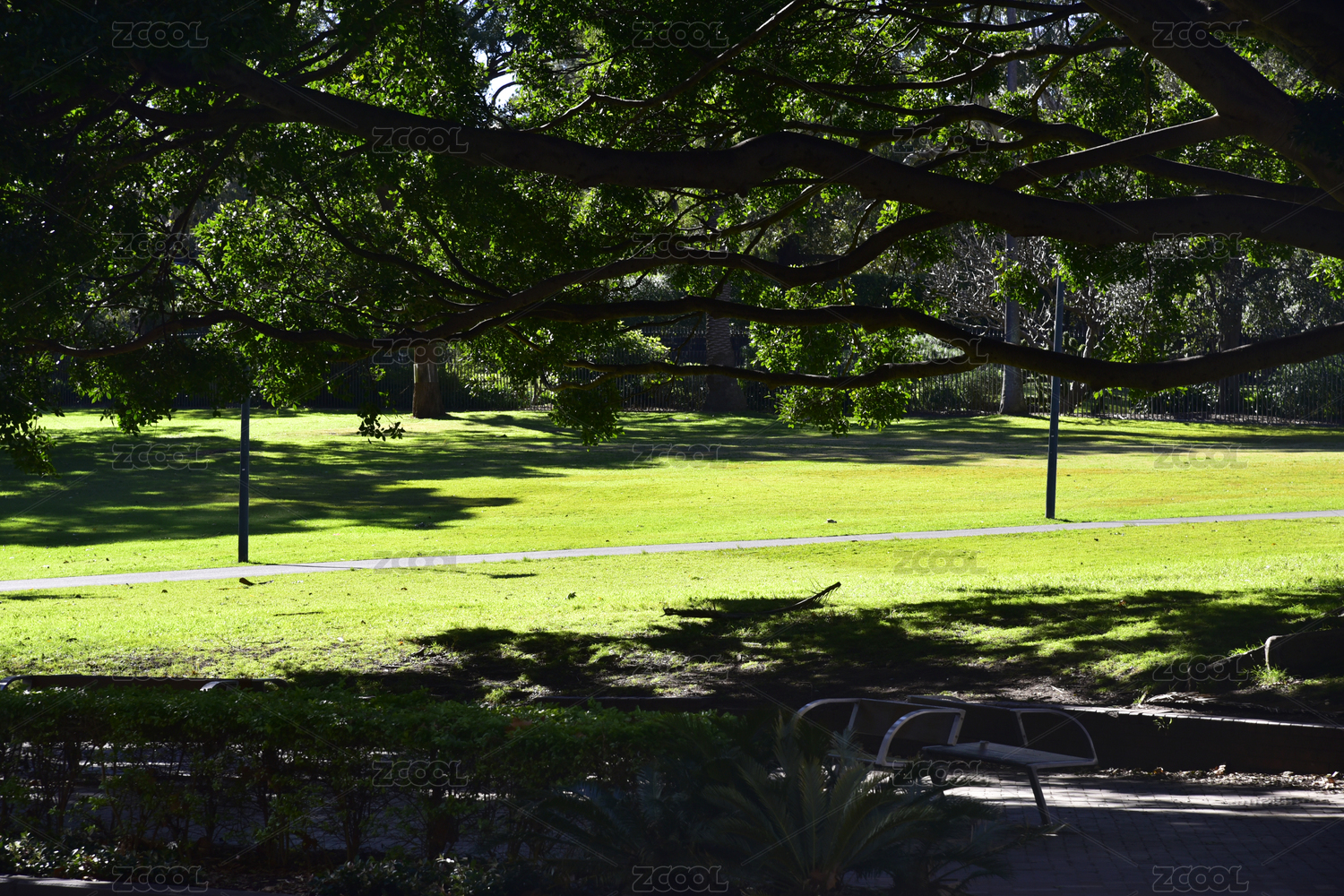 澳大利亞悉尼皇家植物園公園草坪綠樹長(zhǎng)椅