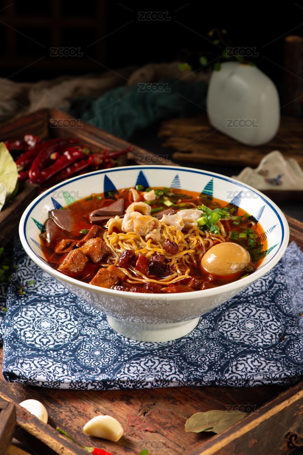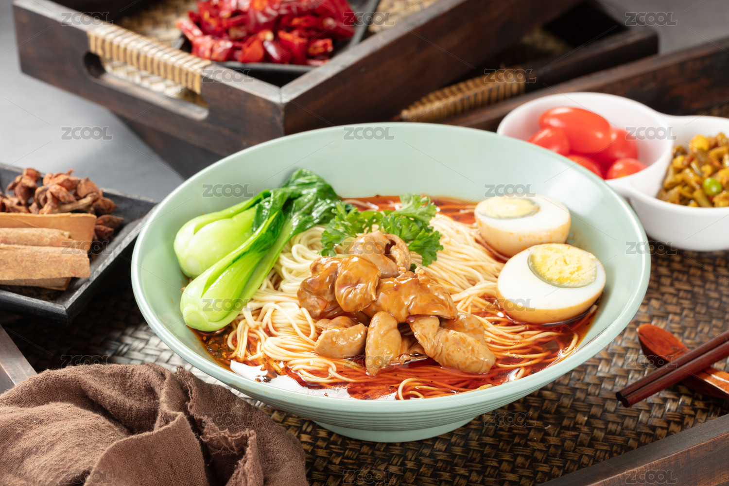 木盒上大碗里的重慶麻辣肥腸面