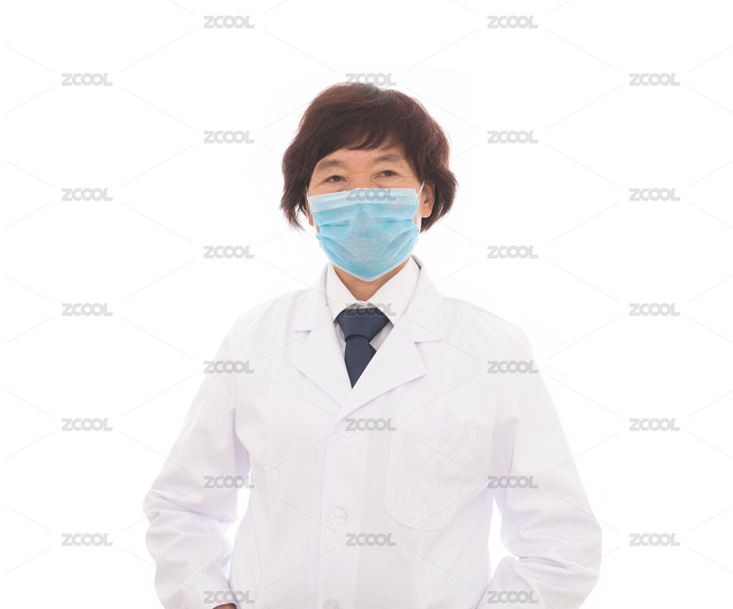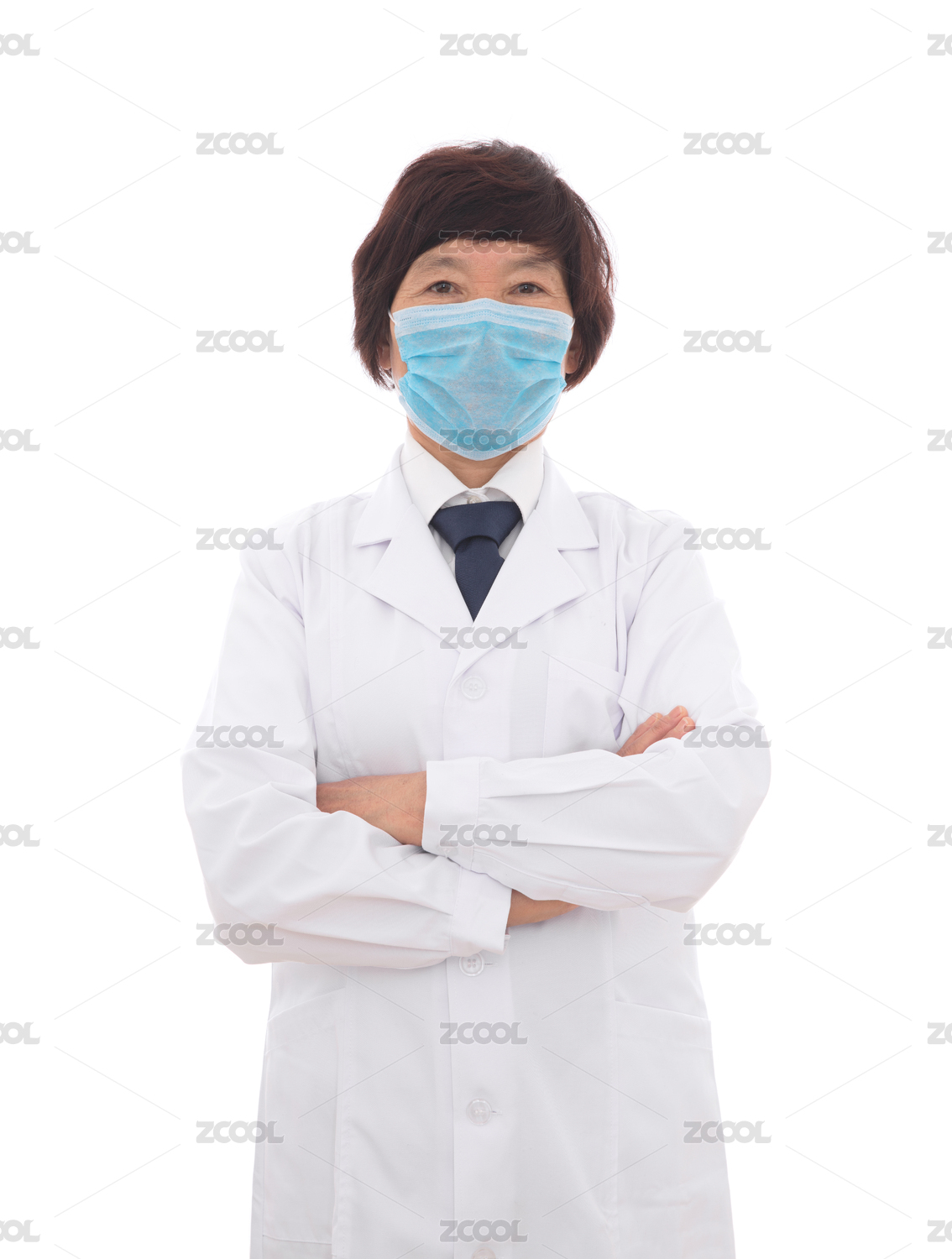 抱著胳膊戴著口罩站白背景前的女醫(yī)生