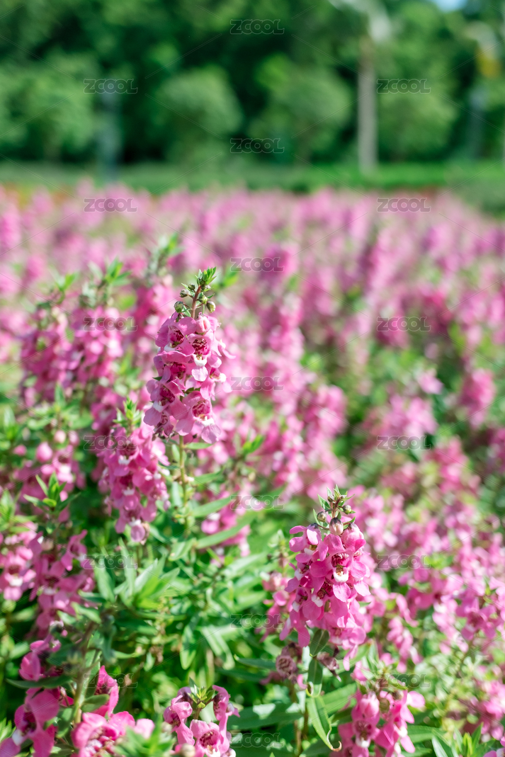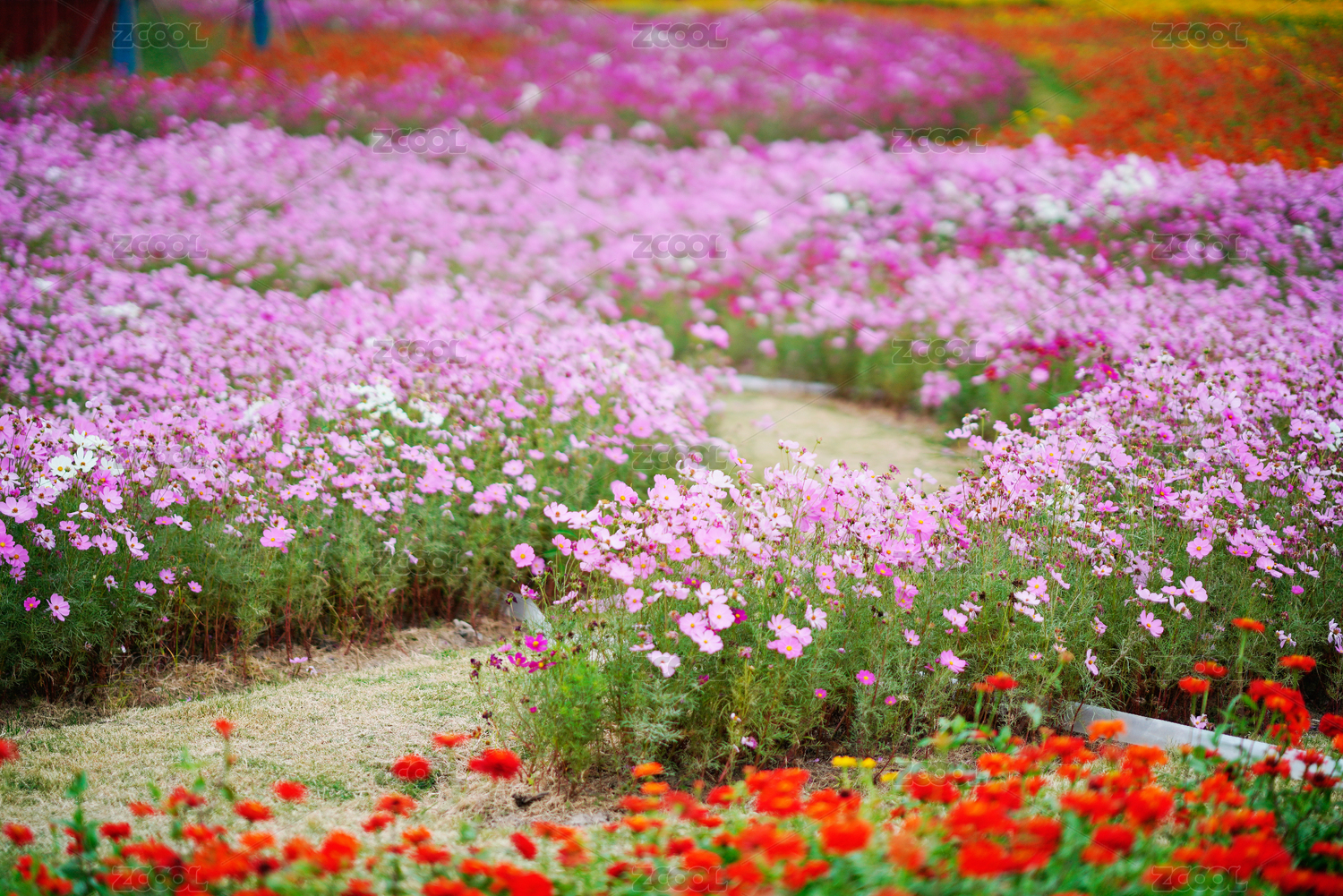 公共園林內(nèi)植物栽種區(qū)內(nèi)粉紫色的波斯菊
