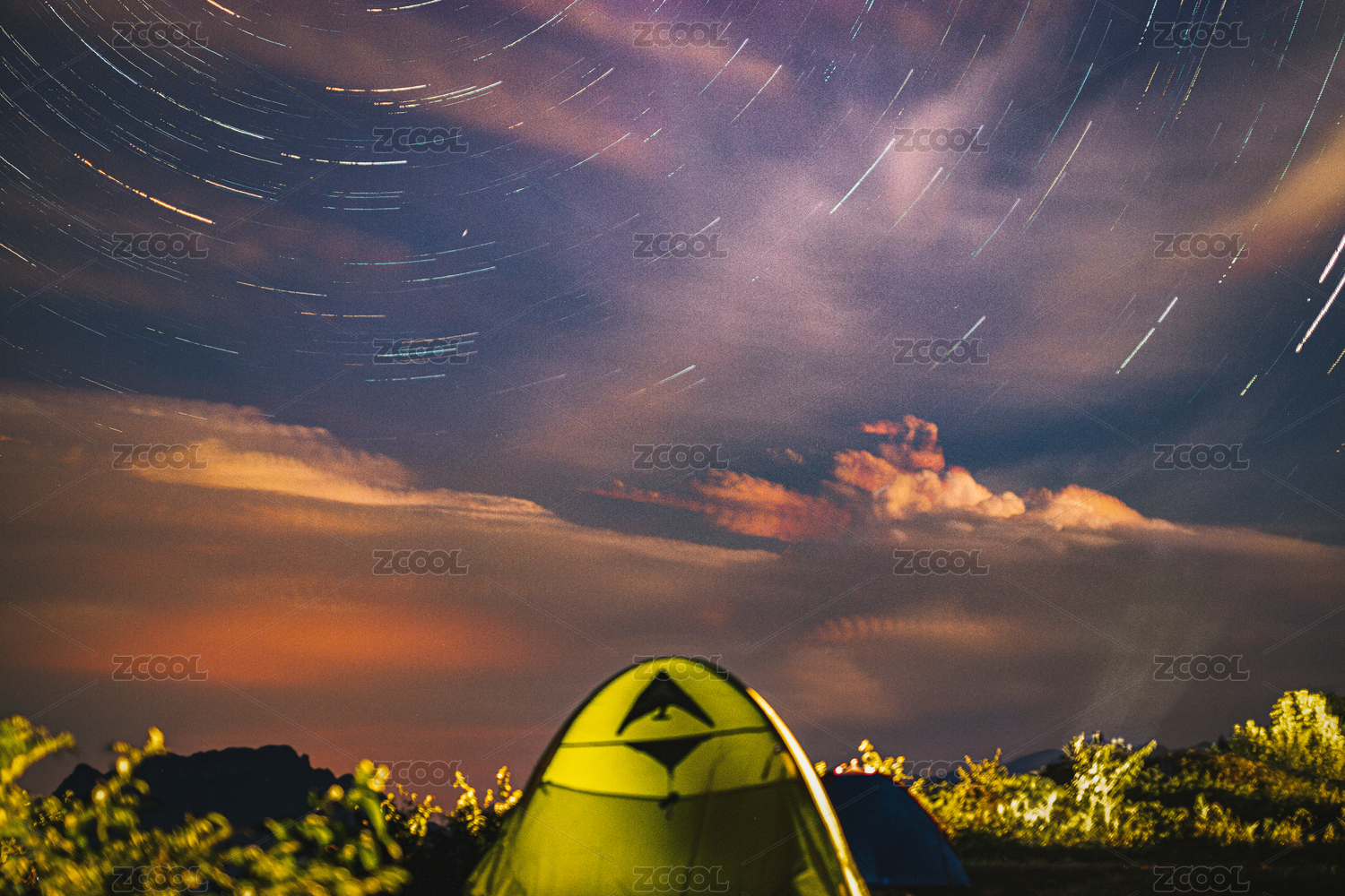 粉紫色的星軌下黃色的露營(yíng)帳篷