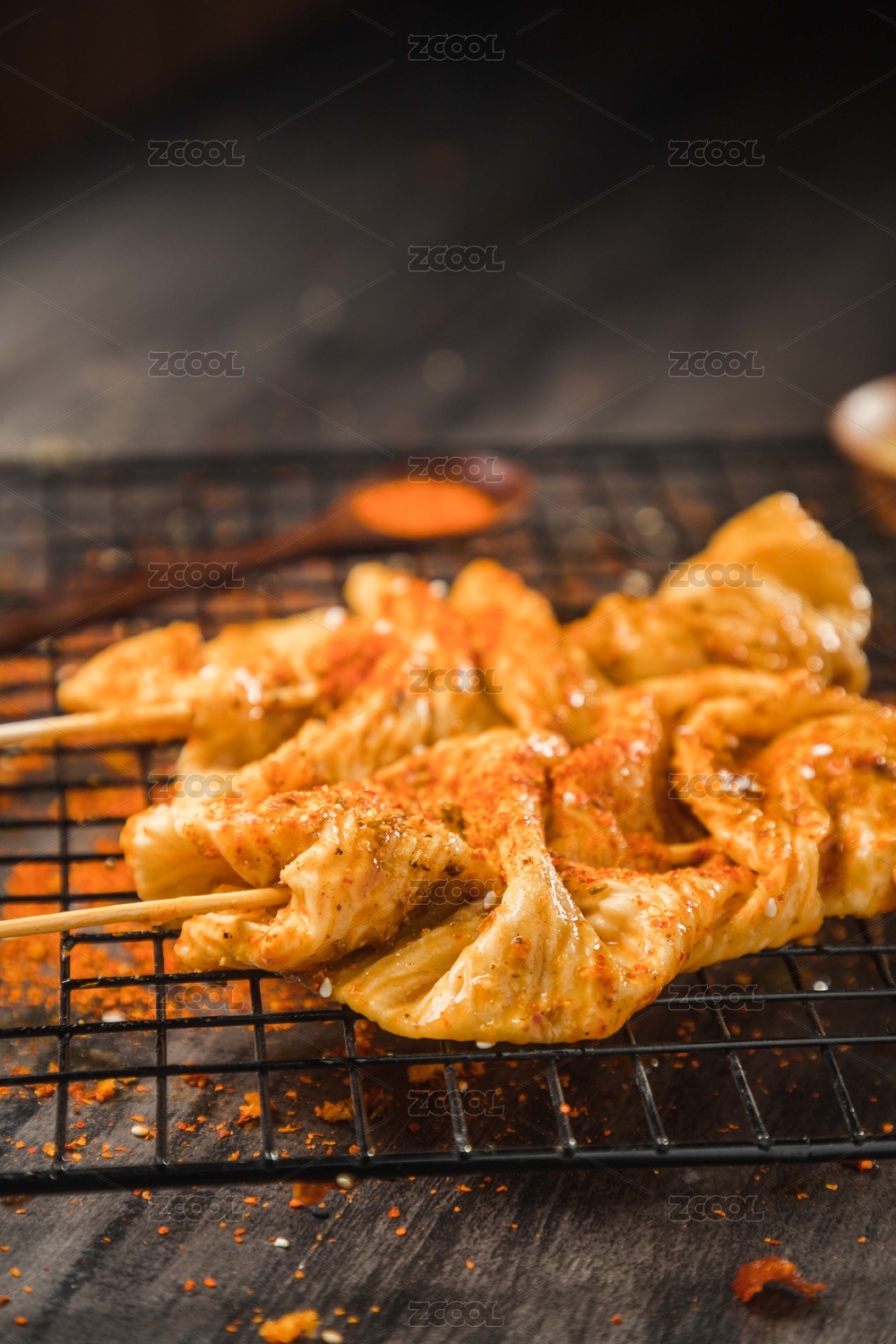 黑色烤架上放著幾串撒著辣椒面的油炸豆皮