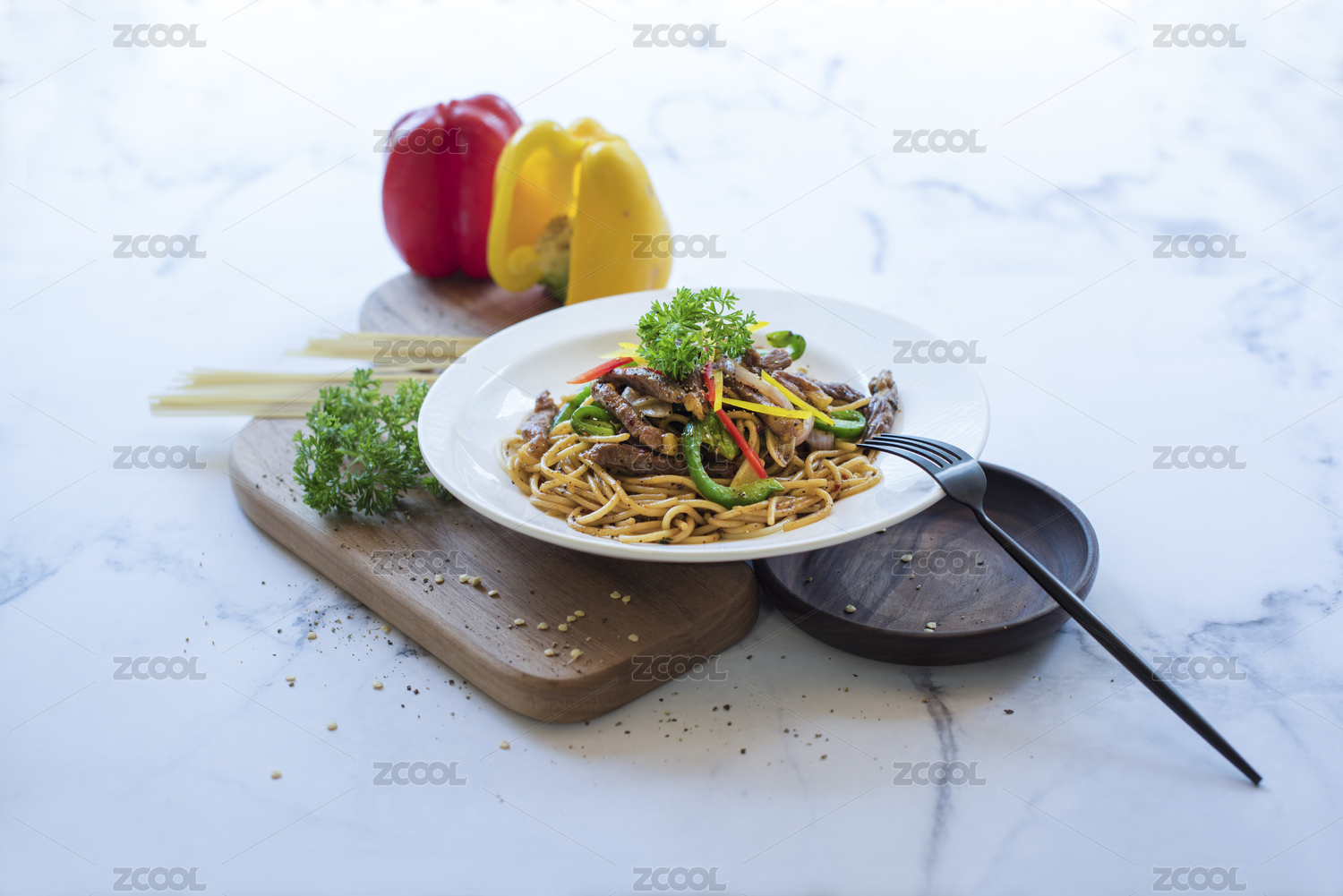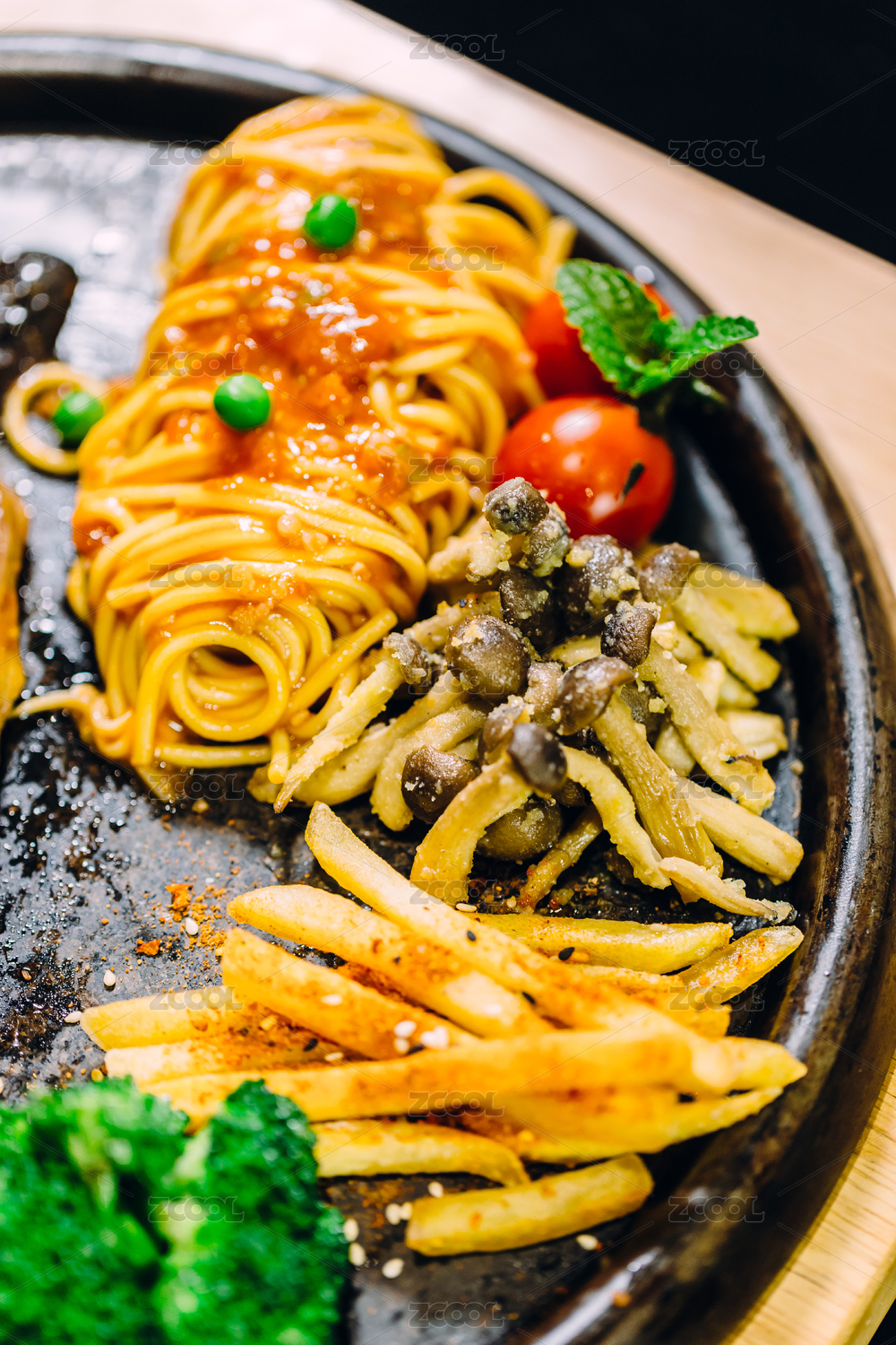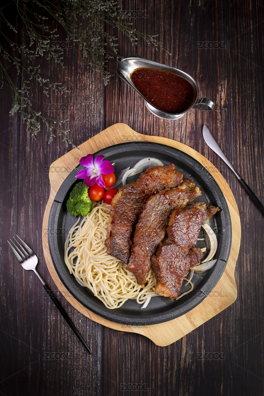 黑色鐵板上的西餐牛排黑糊椒意粉