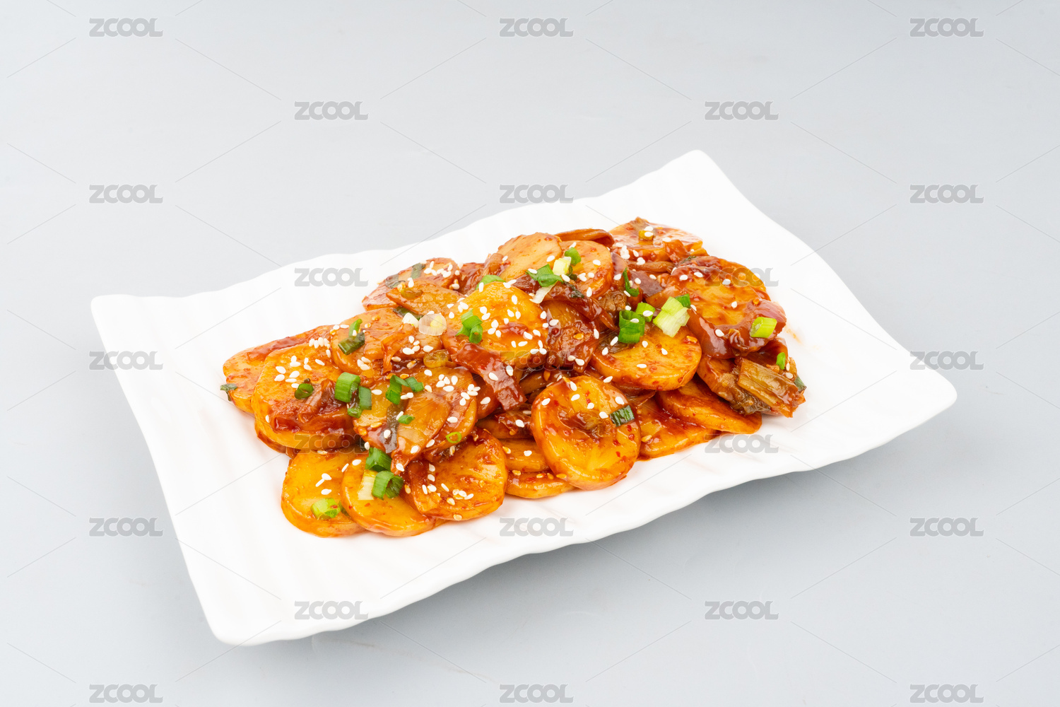 裝在白色盤(pán)子里的辣炒年糕