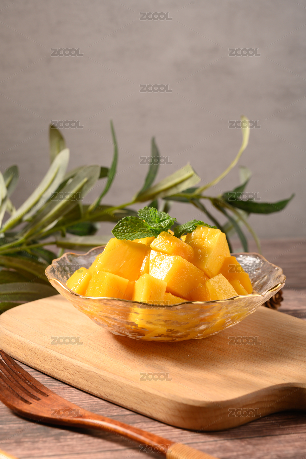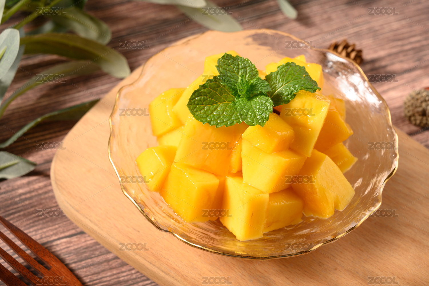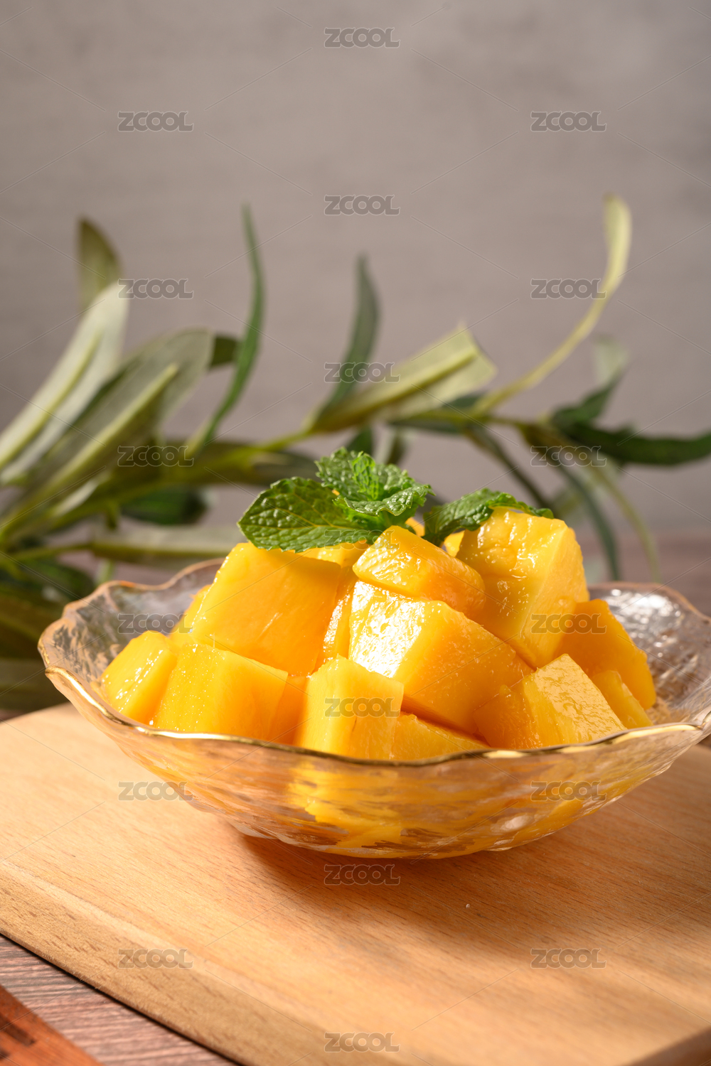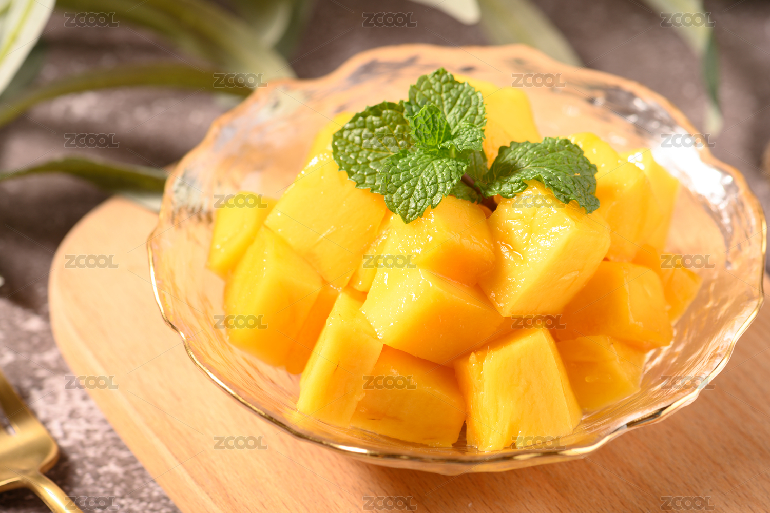 桌面上的玻璃盤子里的美味可口的芒果粒