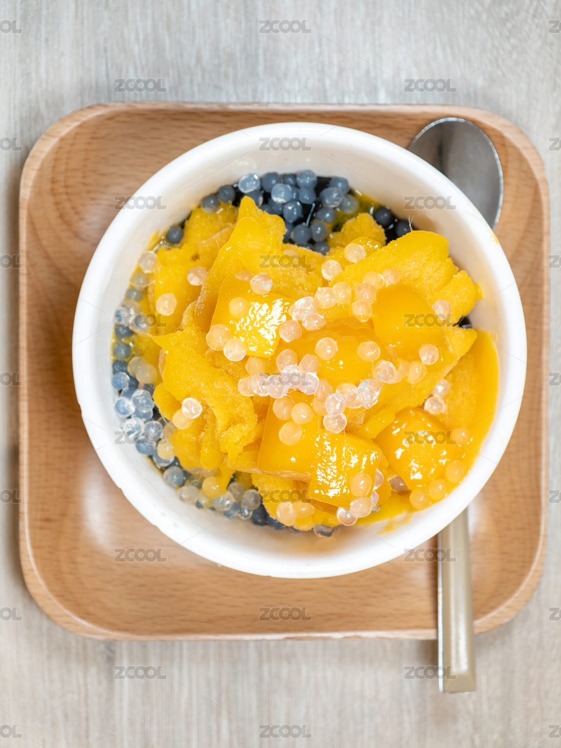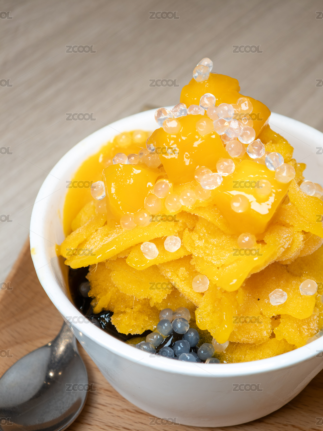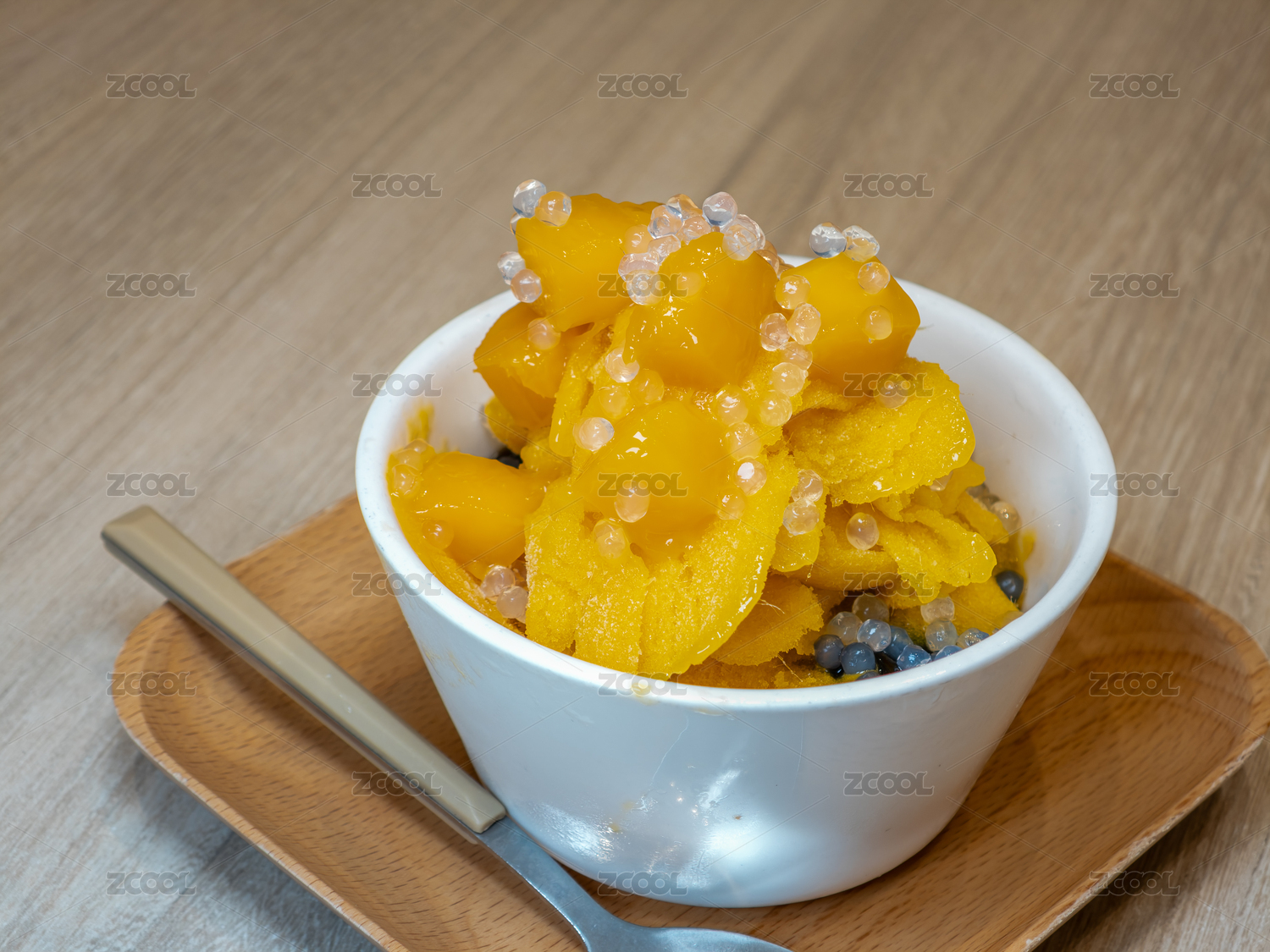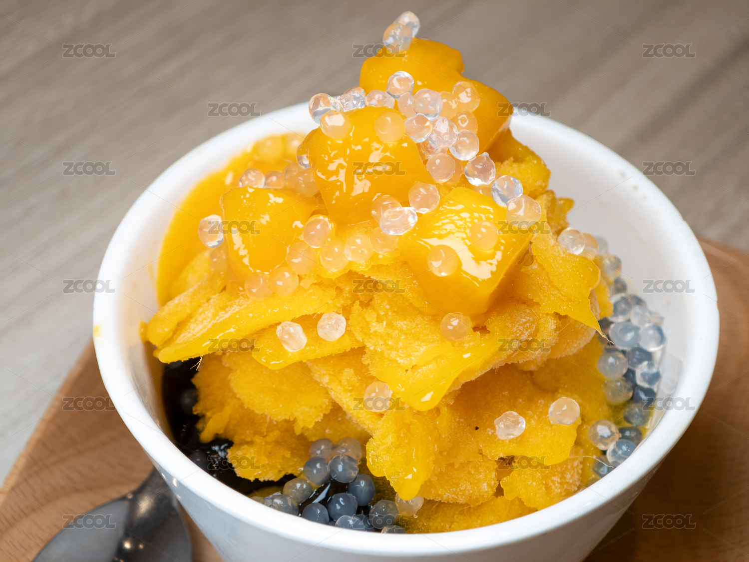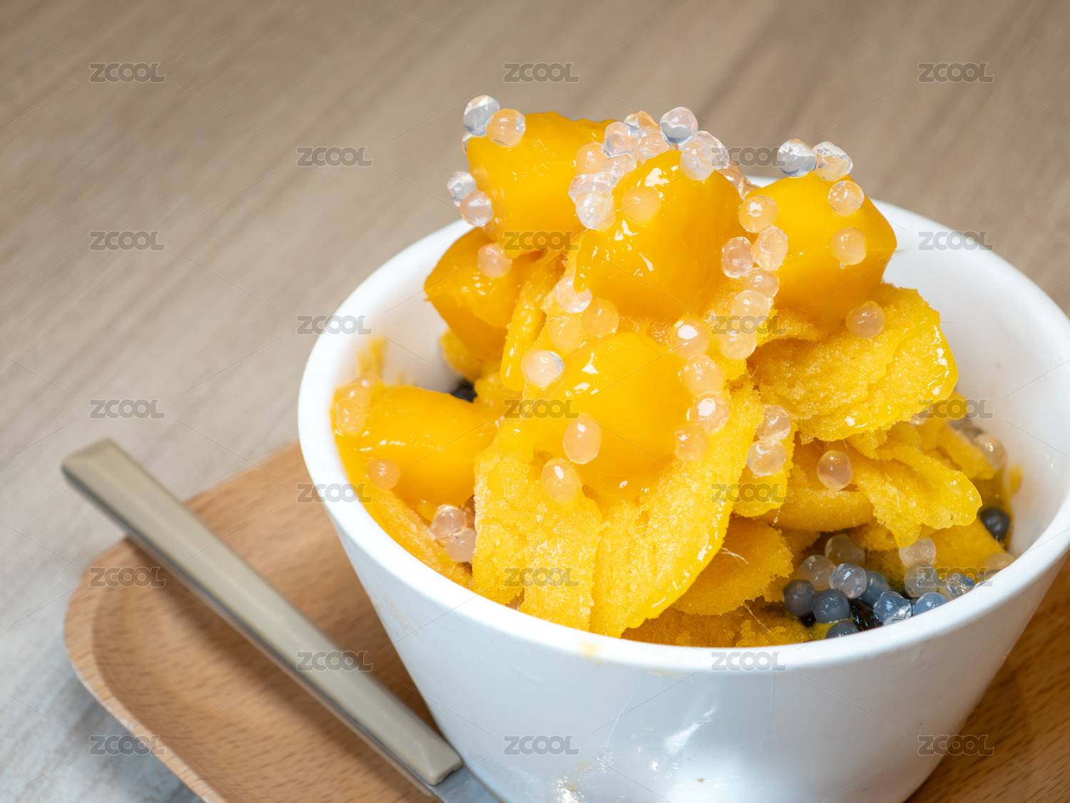一碗配有新鮮芒果塊和爆爆珠的芒果冰沙