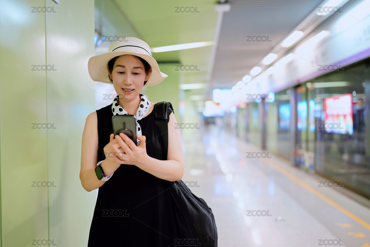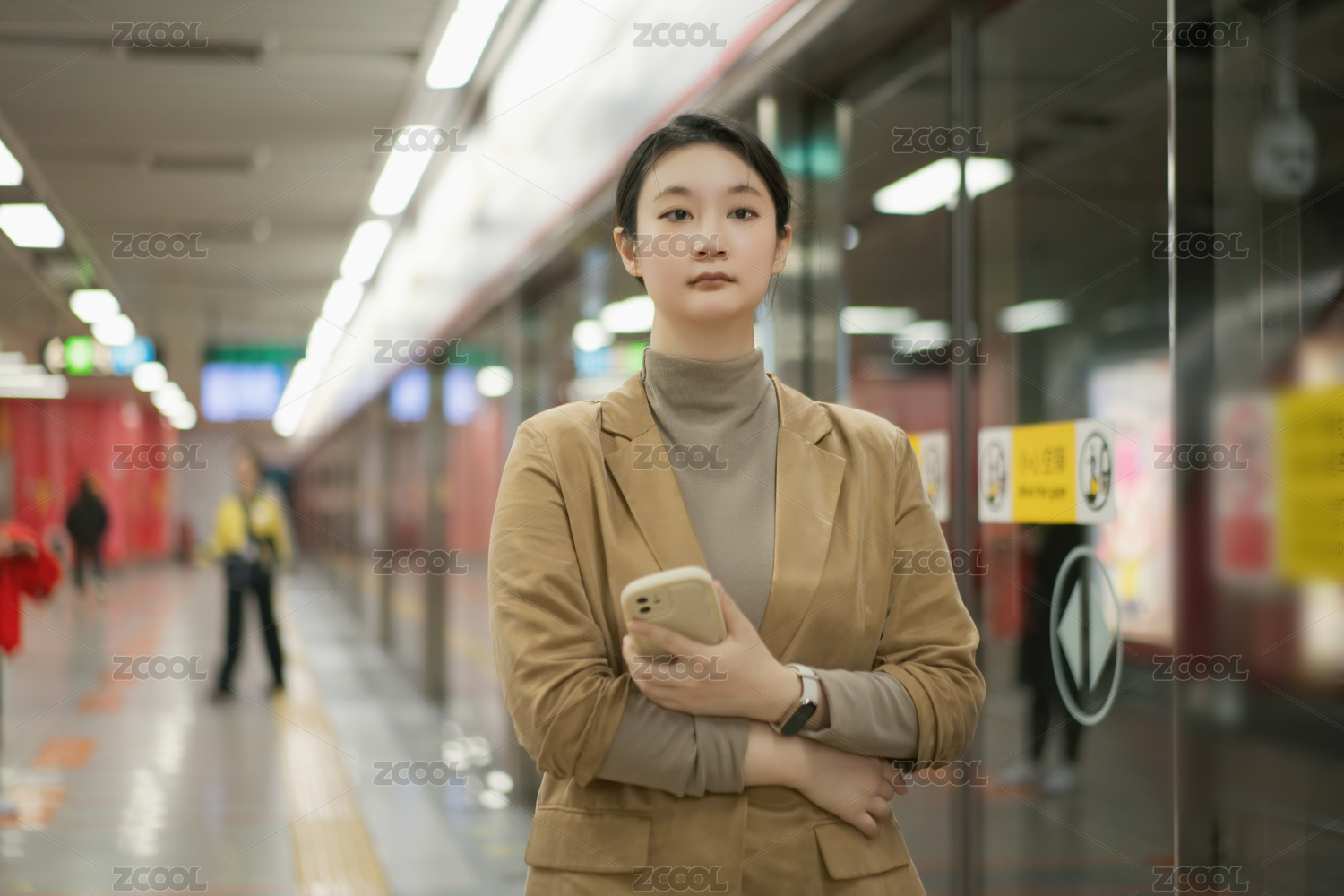 穿著時(shí)尚服裝的自信女人在地鐵站等著