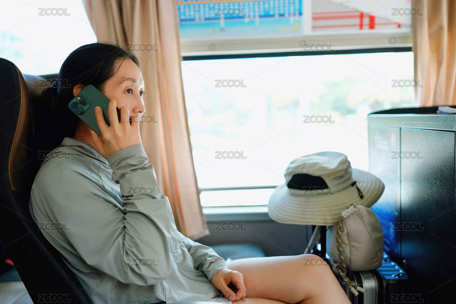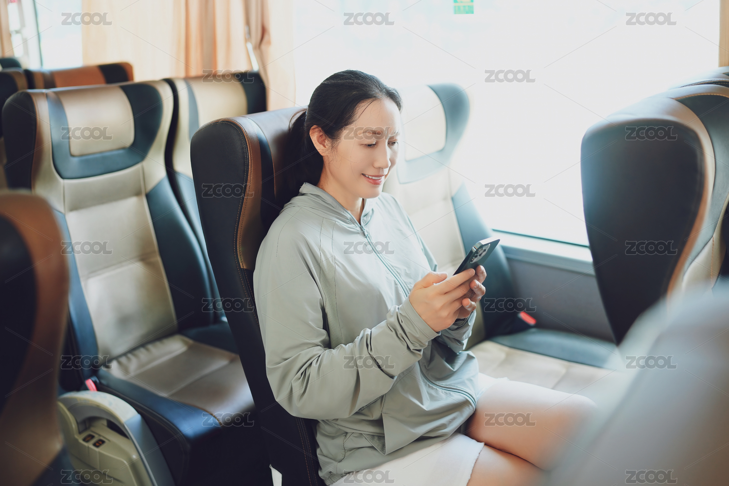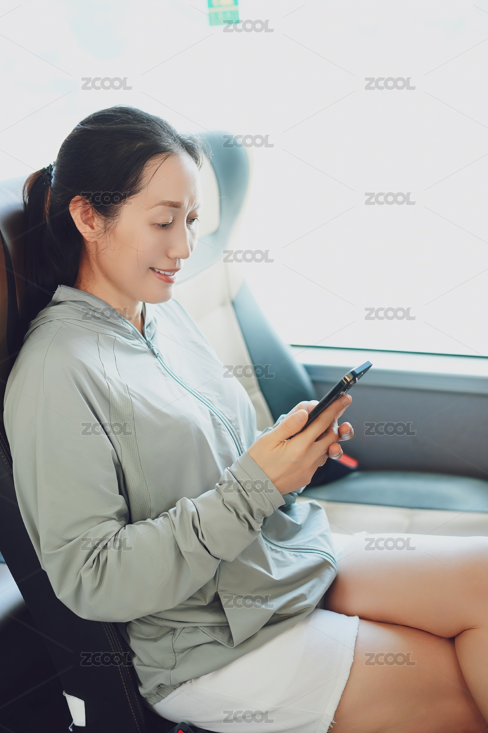 放松的年輕女子在公共交通工具上使用手機(jī)