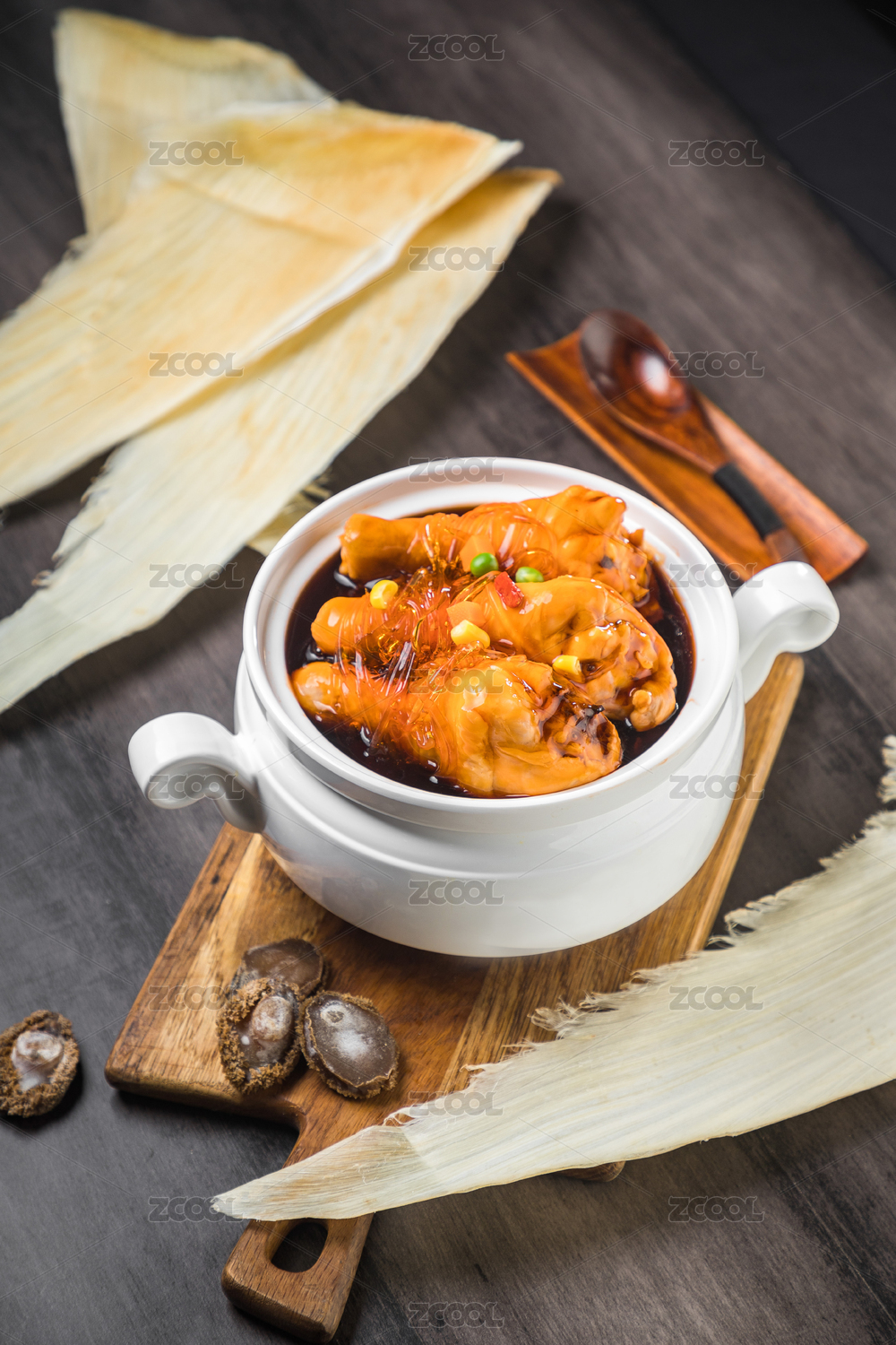 暗色木紋桌上放著一碗鮑汁魚翅燴雞腿撈飯