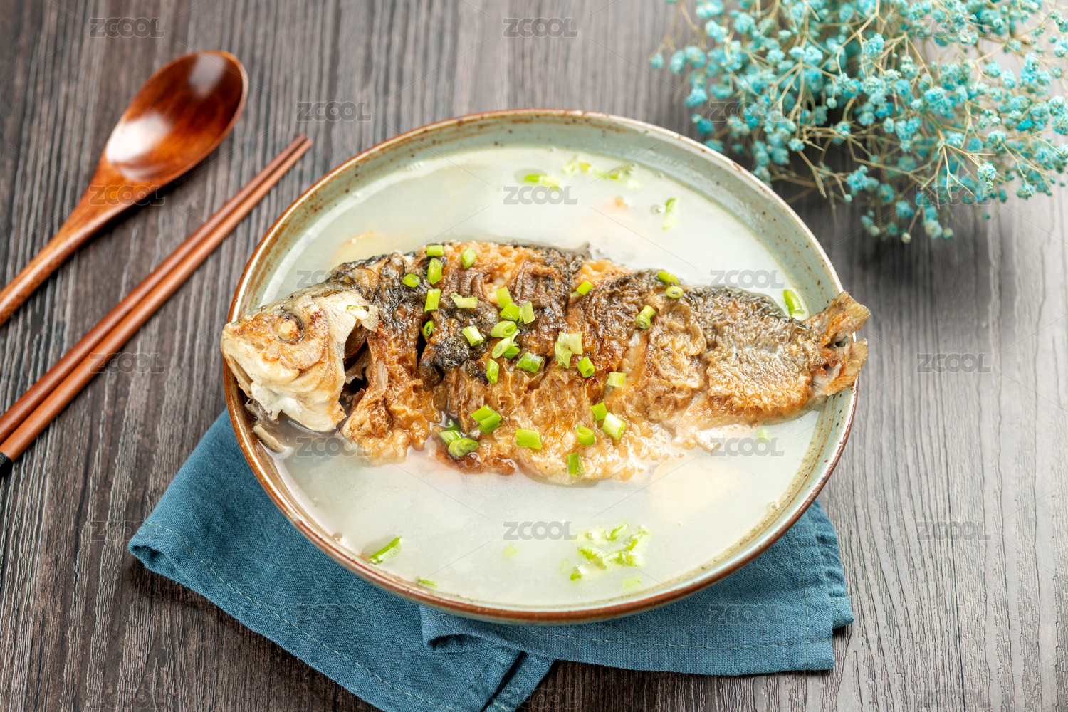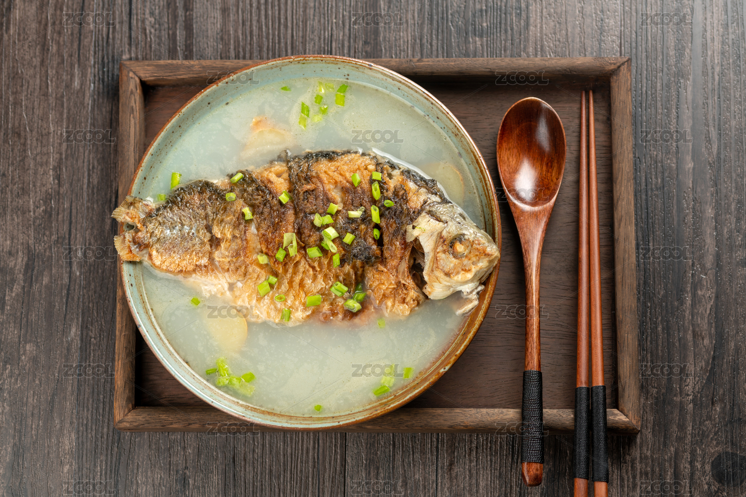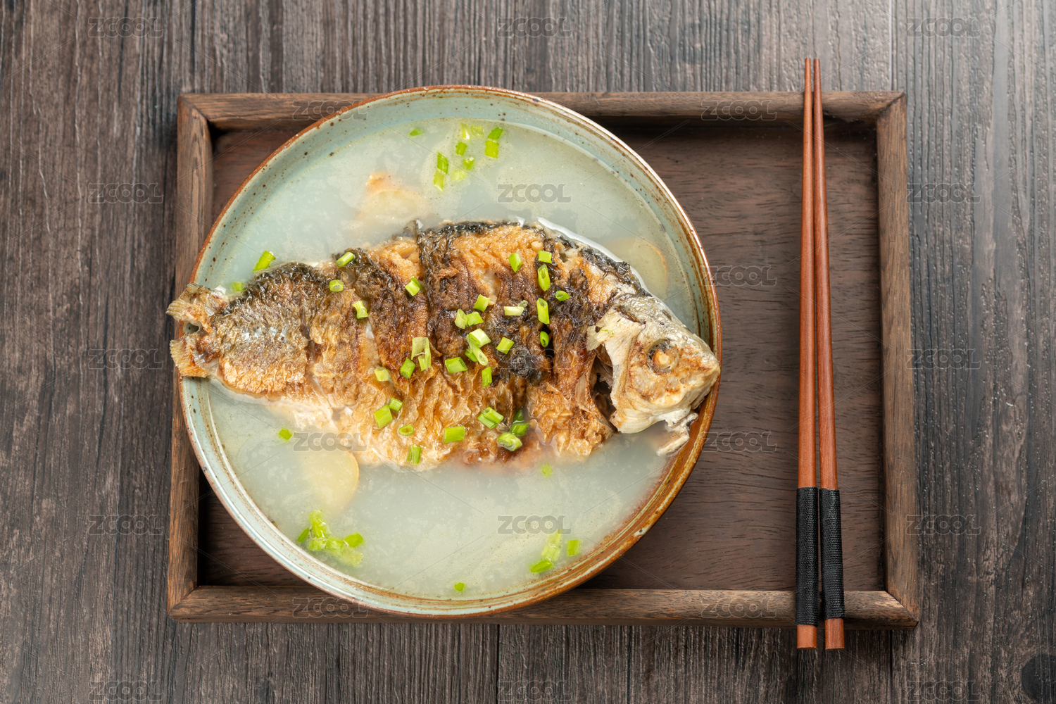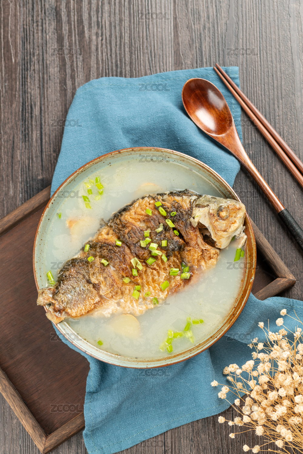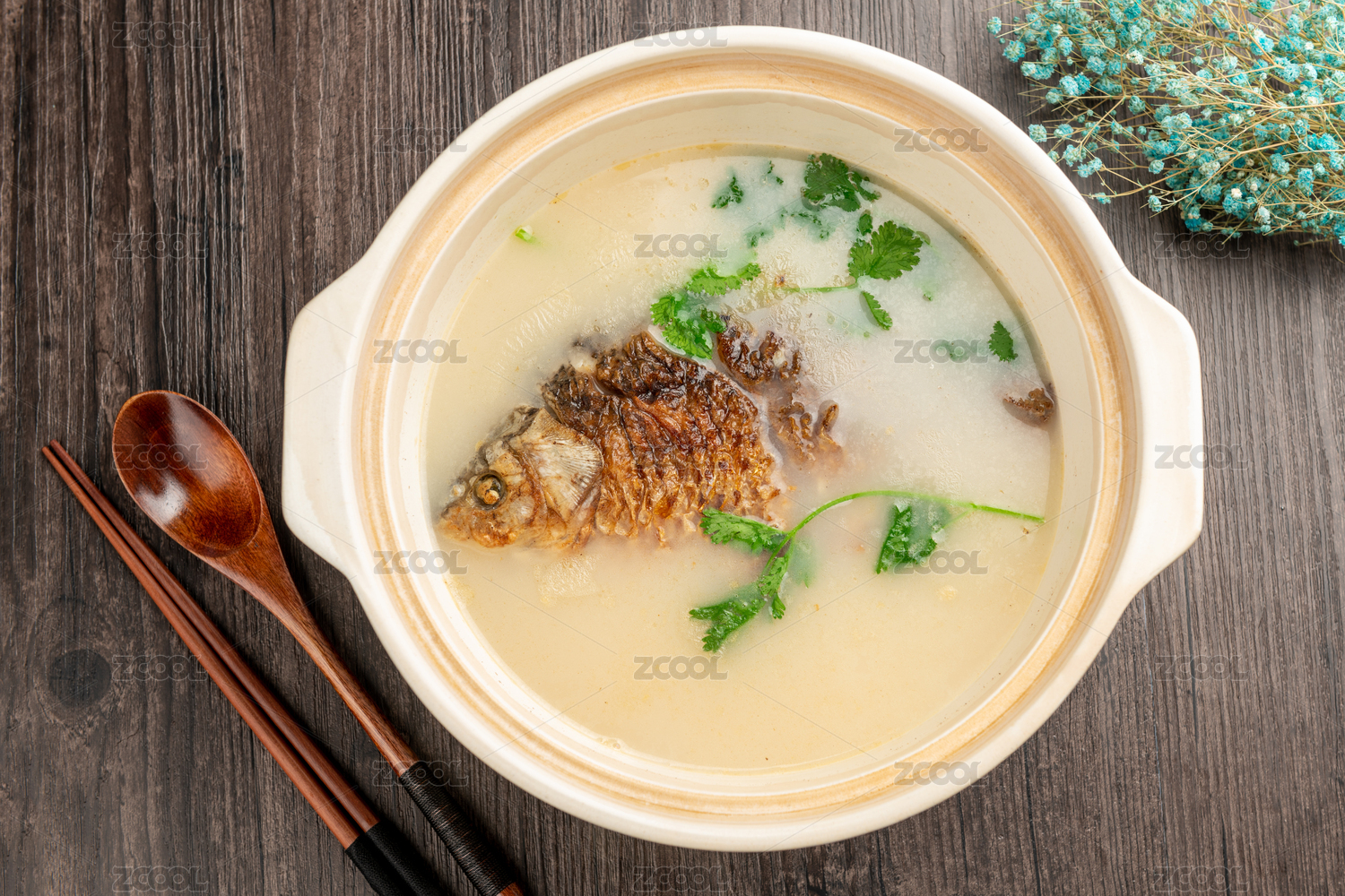 砂鍋鯽魚湯擺放在木桌面上特寫