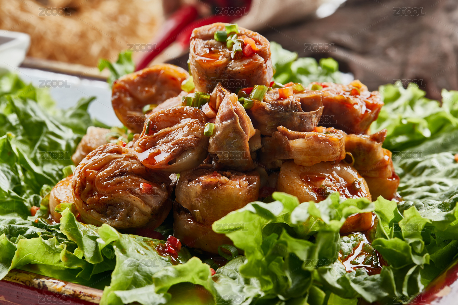 木質(zhì)托盤裝的美味蒙餐香辣灌肉腸