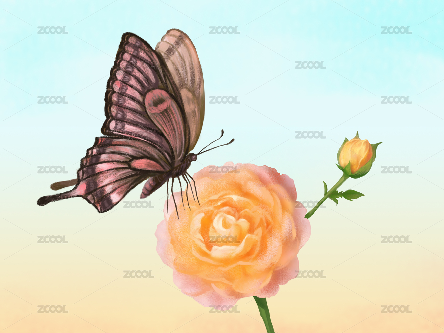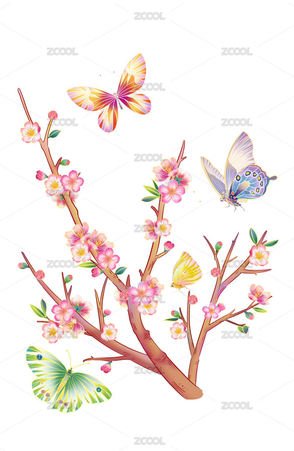 手繪的桃花蝴蝶插畫(huà)背景元素