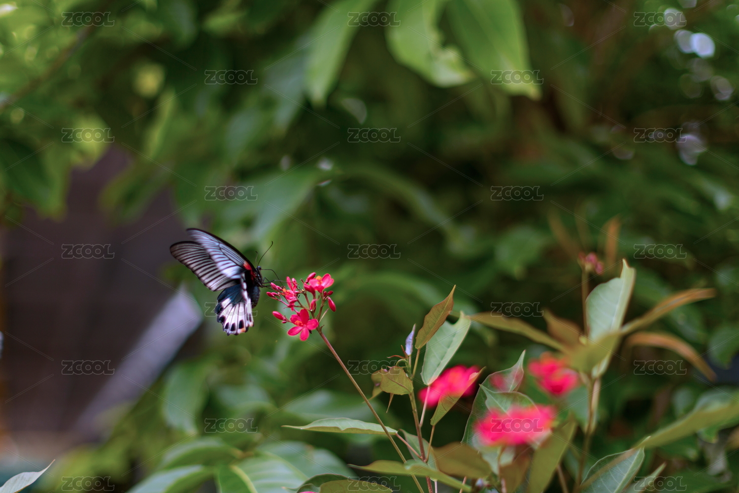 一只紅黑相間的花蝴蝶落在玫瑰花上