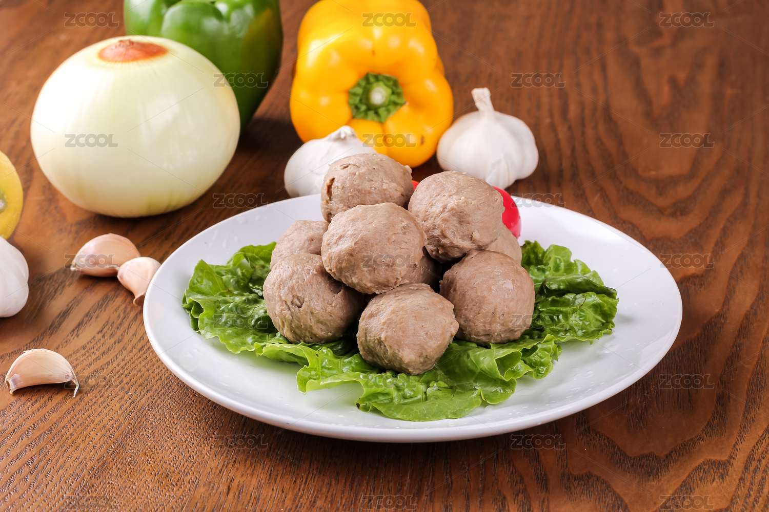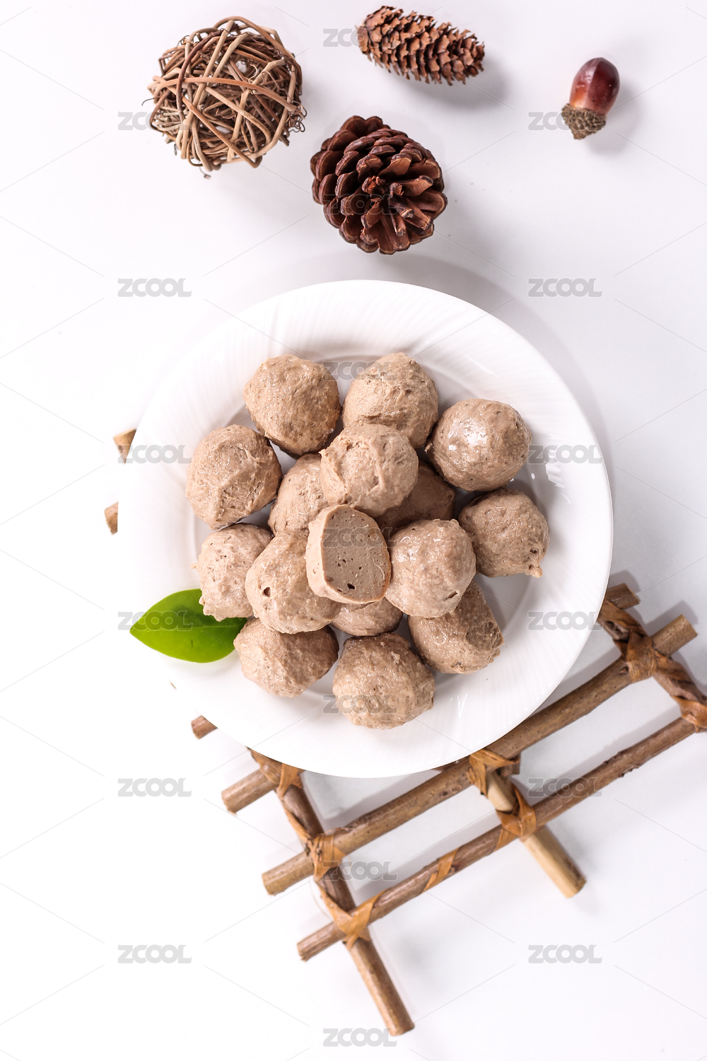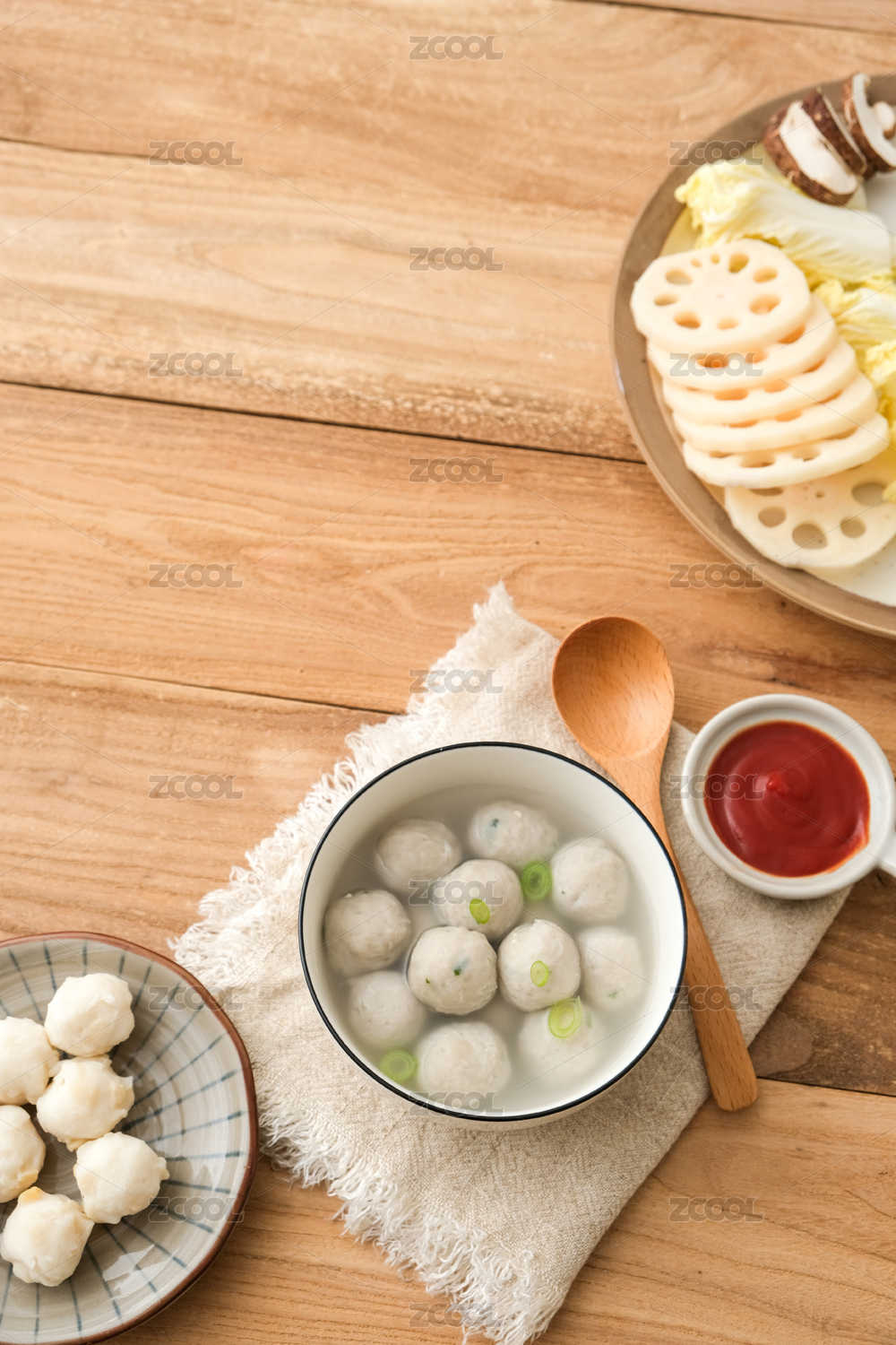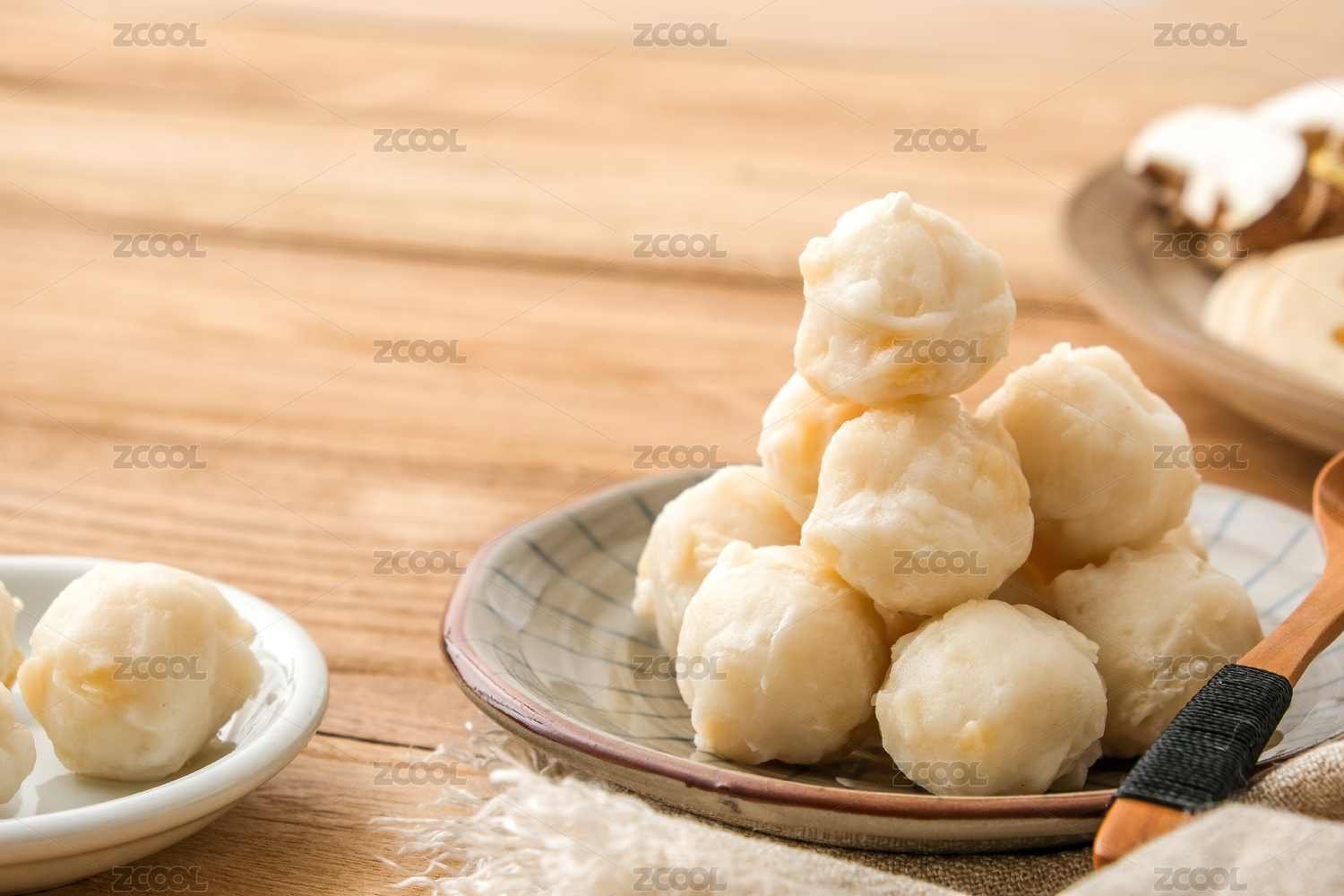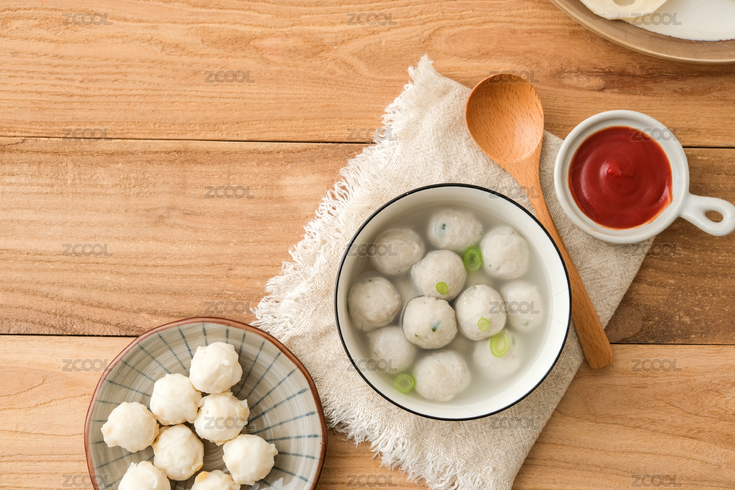 木頭餐桌上白餐具里的海鮮鲅魚丸子