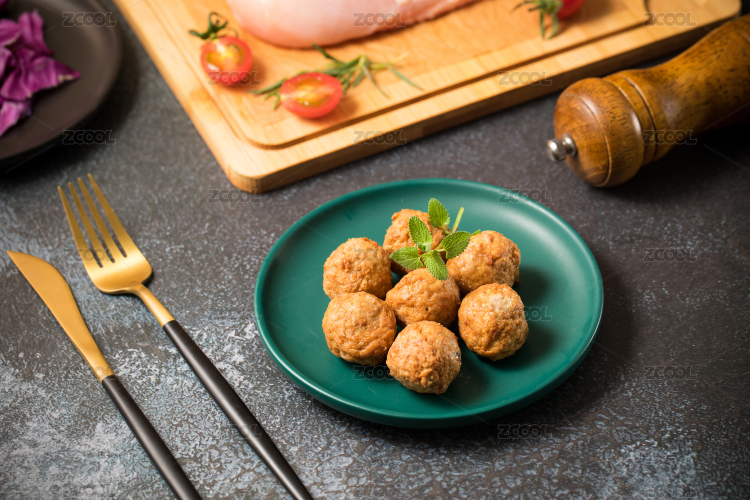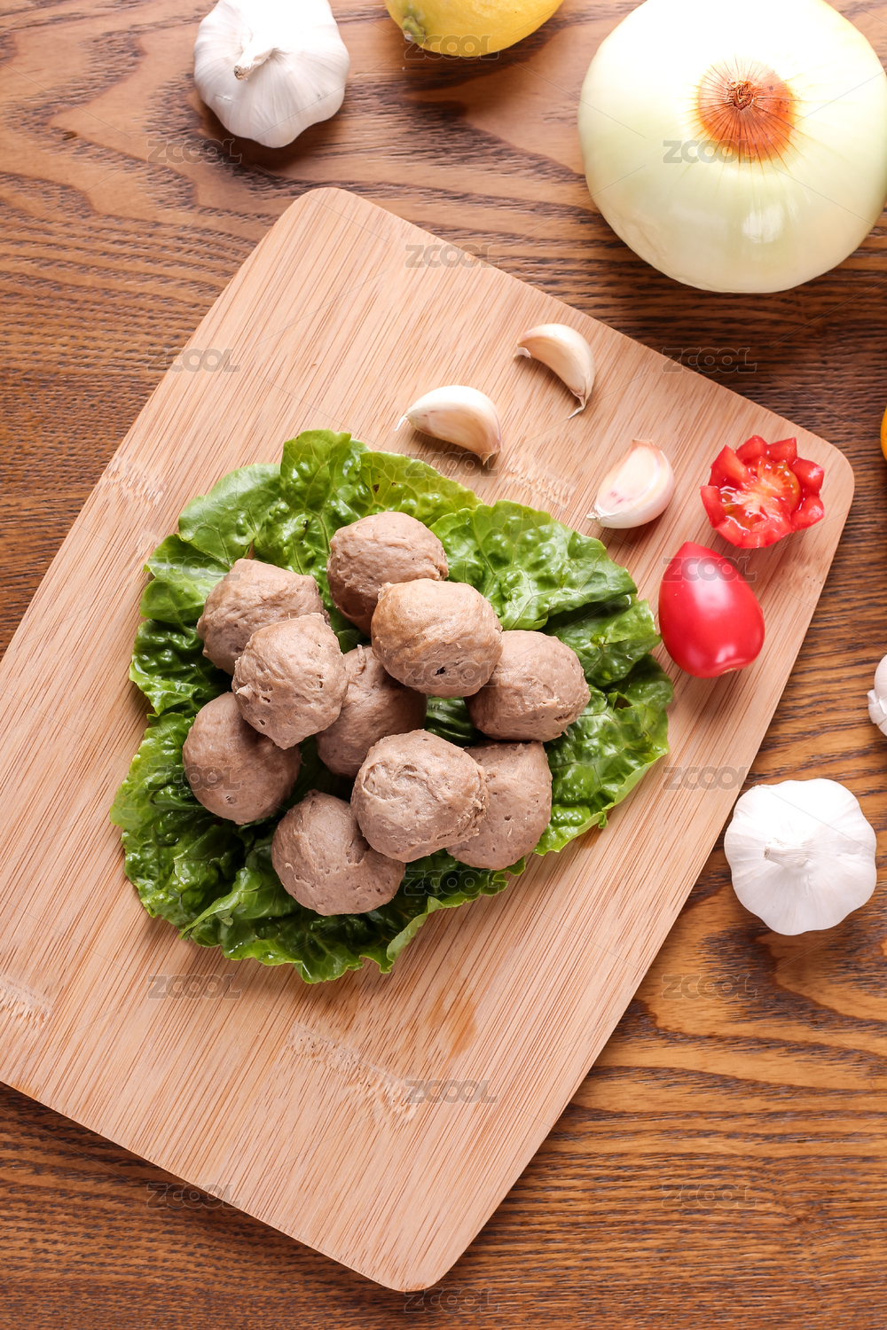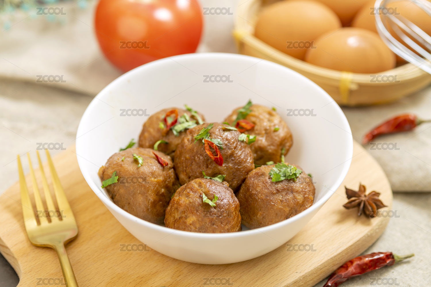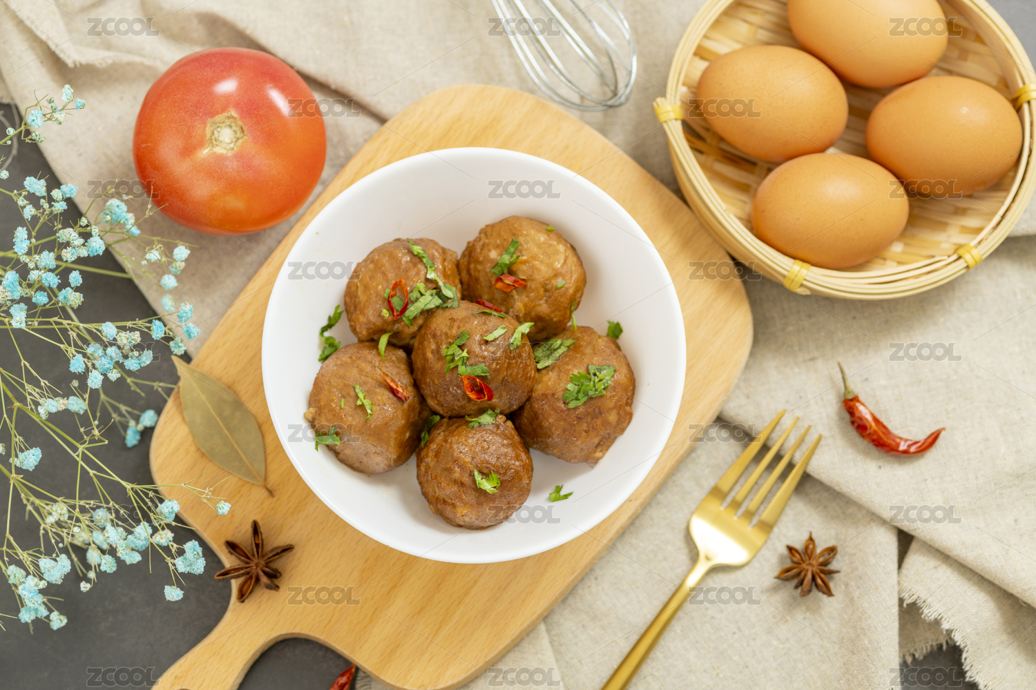 木板背景上滿滿一盤牛肉丸子