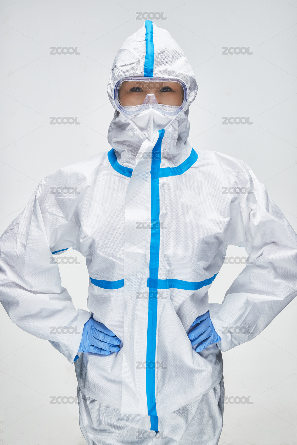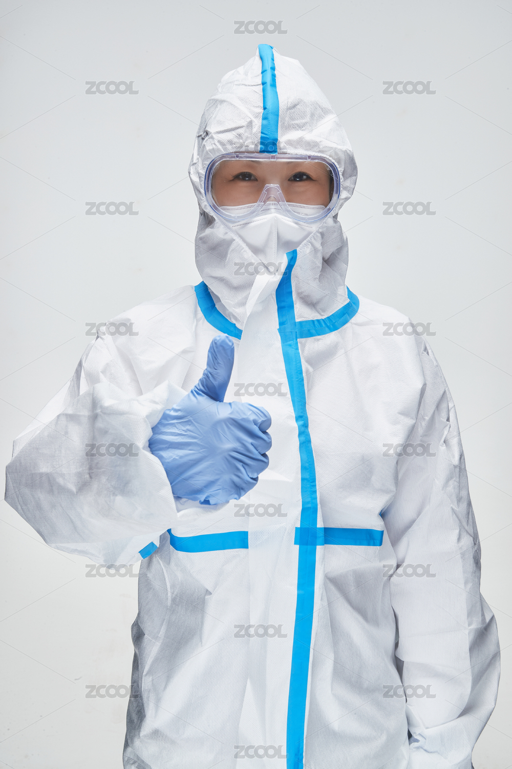 穿白色防護服佩戴護目鏡口罩的女性醫(yī)療人員