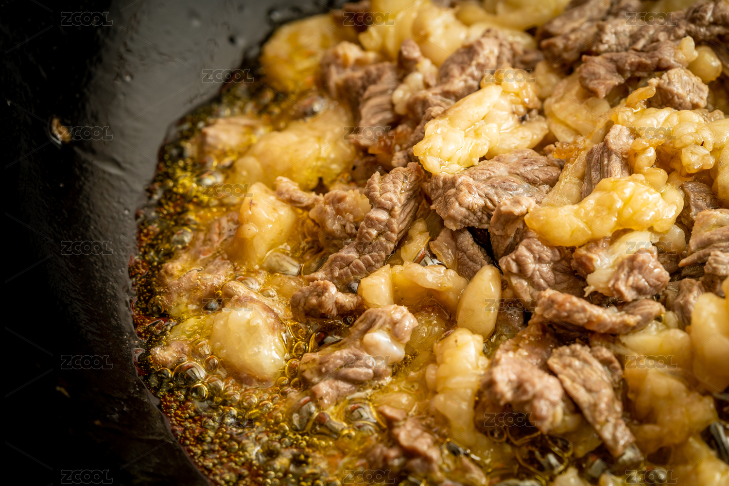 正在油炸的新鮮牛肉和牛板油