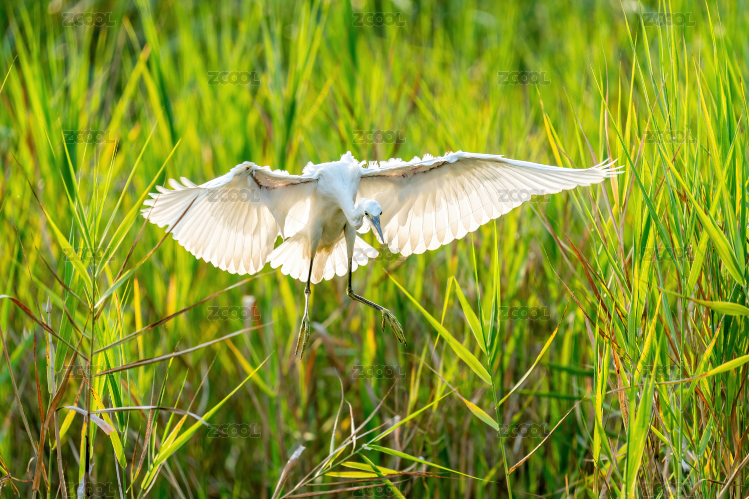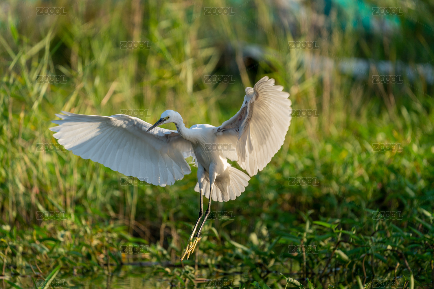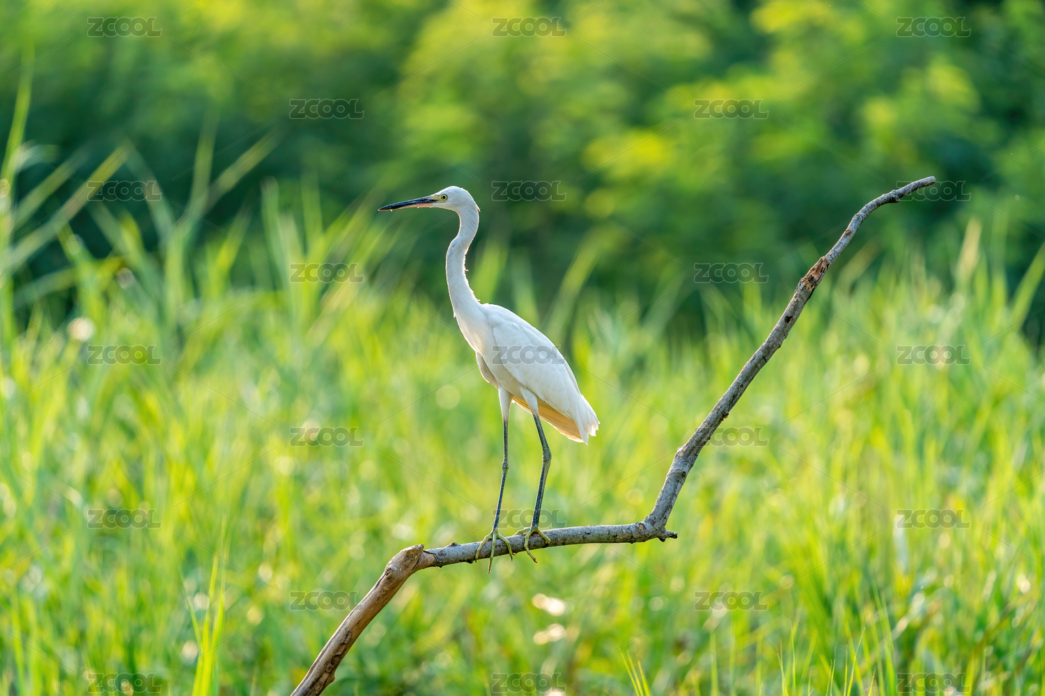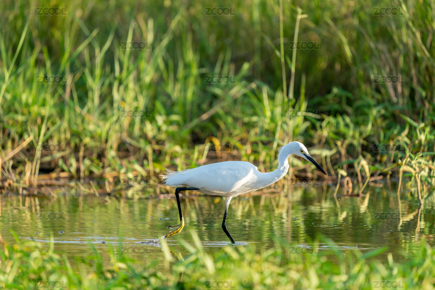一只小白鷺鳥在開闊的沼澤淺水灘里搜尋捕食