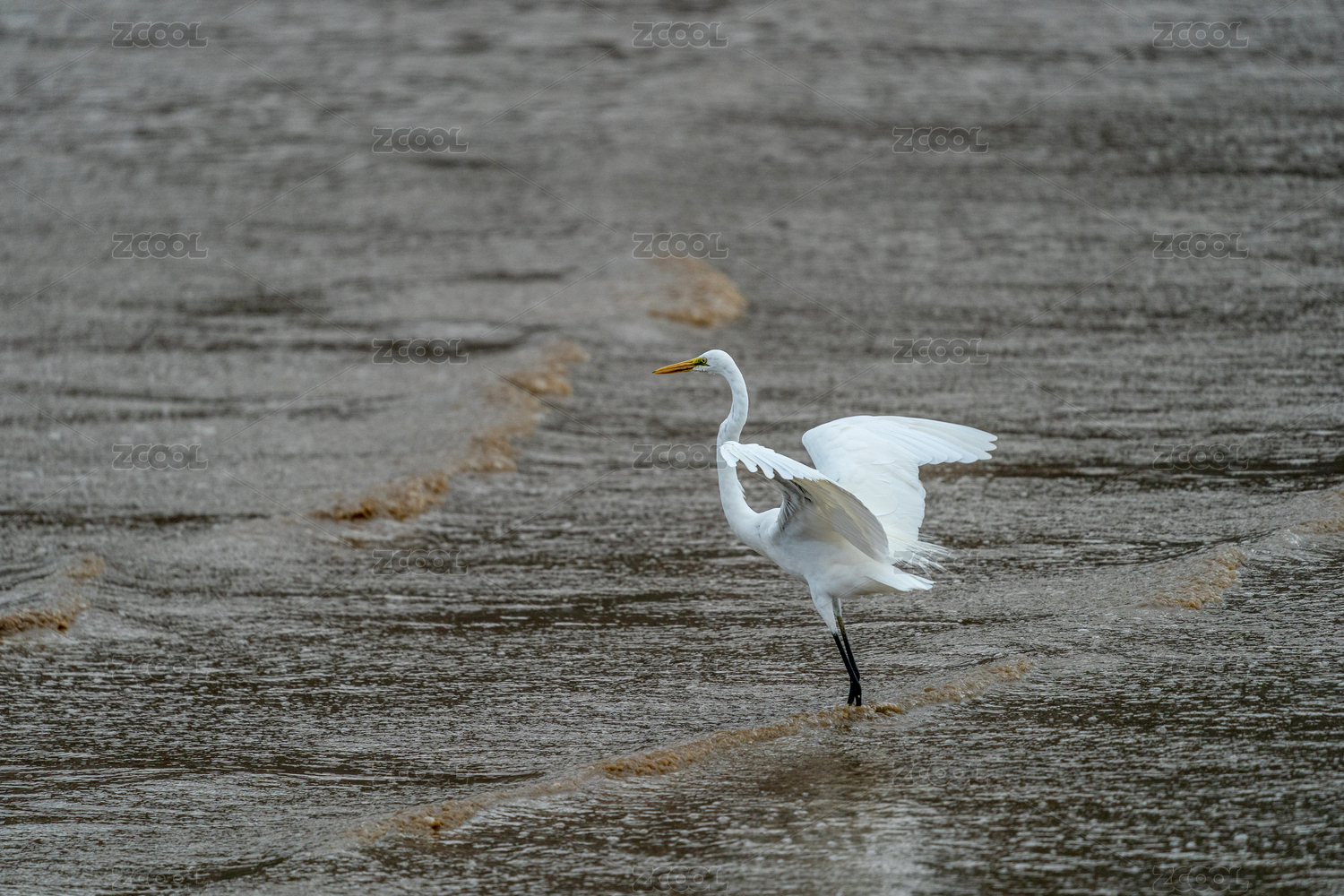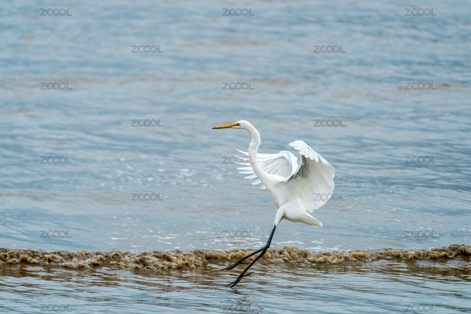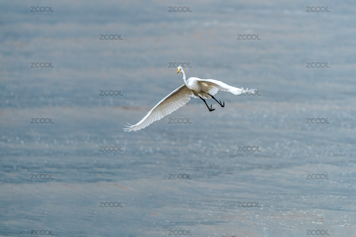 一只大白鷺鳥游蕩飛翔在淺水沼澤上尋覓食物