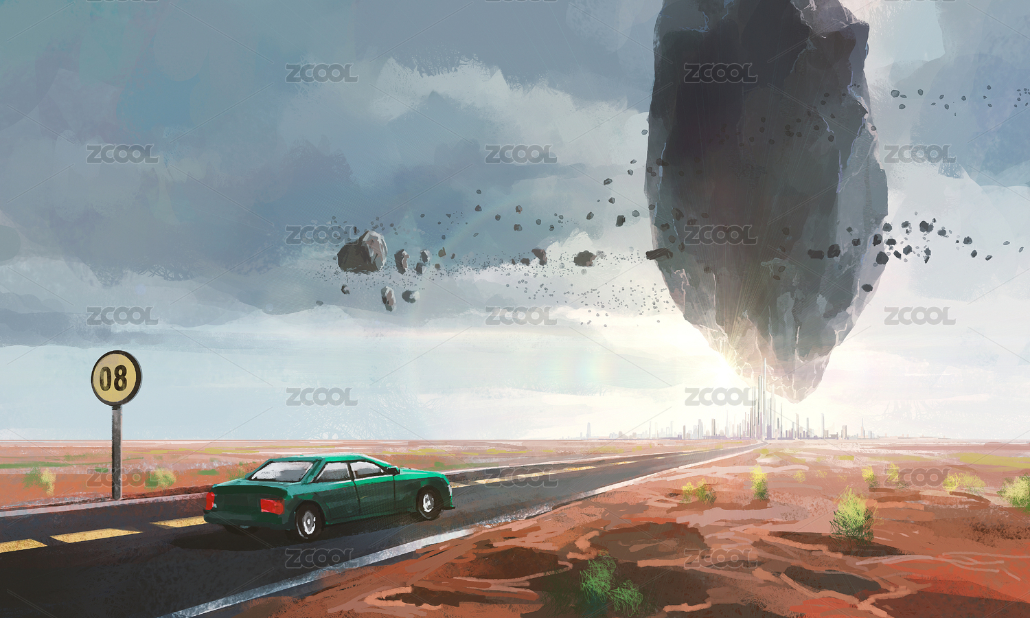 一輛車在無人區(qū)駛向灰色天空下的隕石