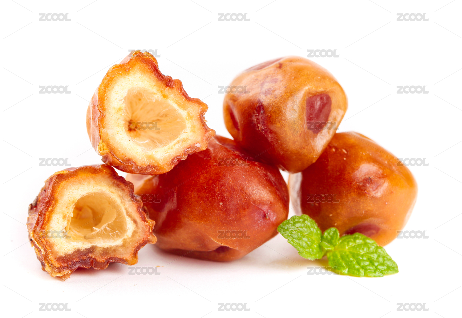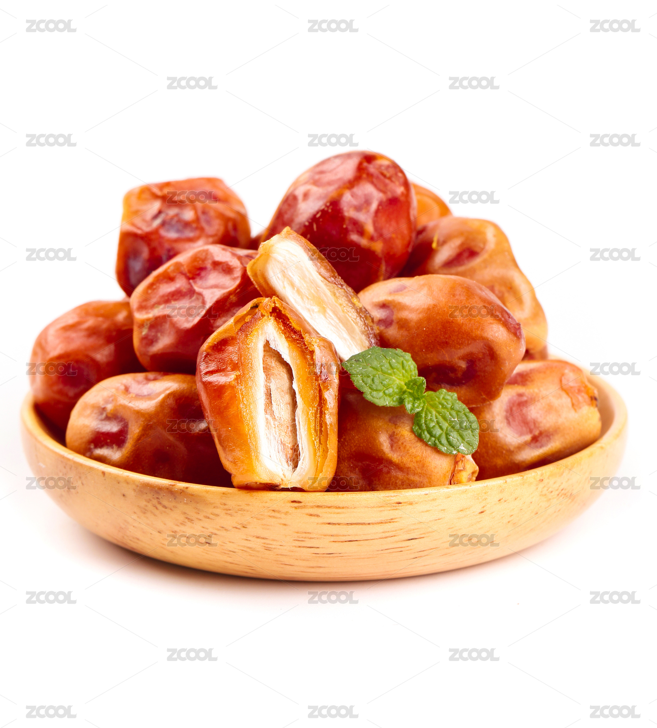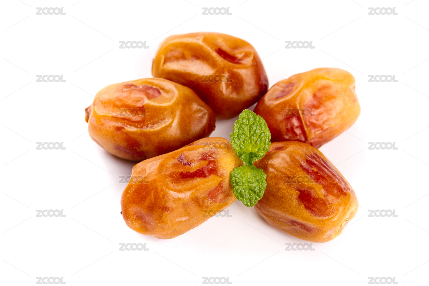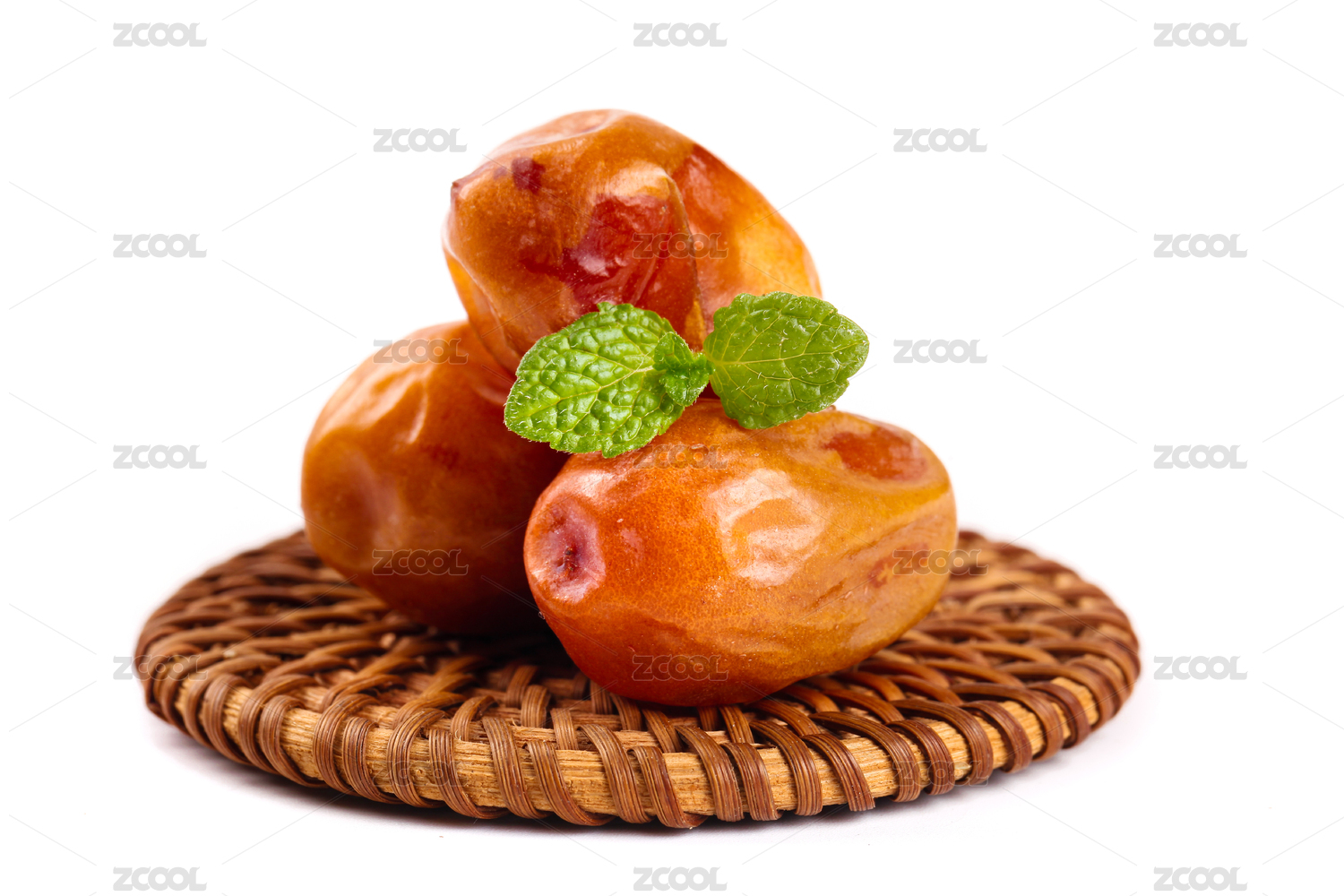 白底上放著兩個完整的黃金椰棗和半邊椰棗
