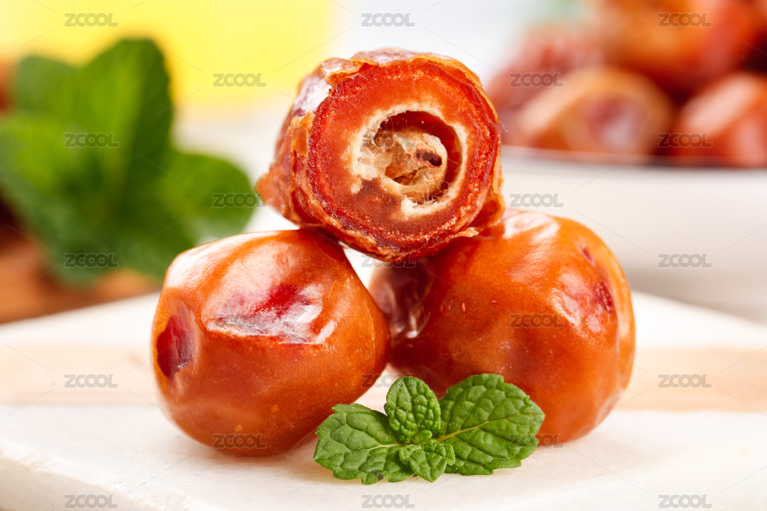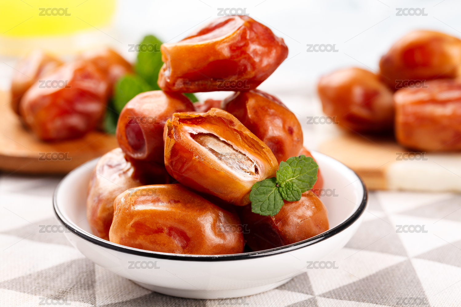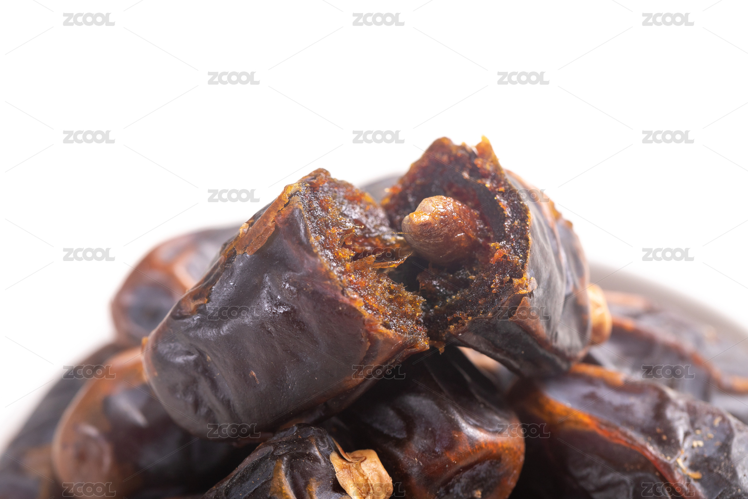 白底上黑石板上放著一堆黃椰棗和切開的椰棗