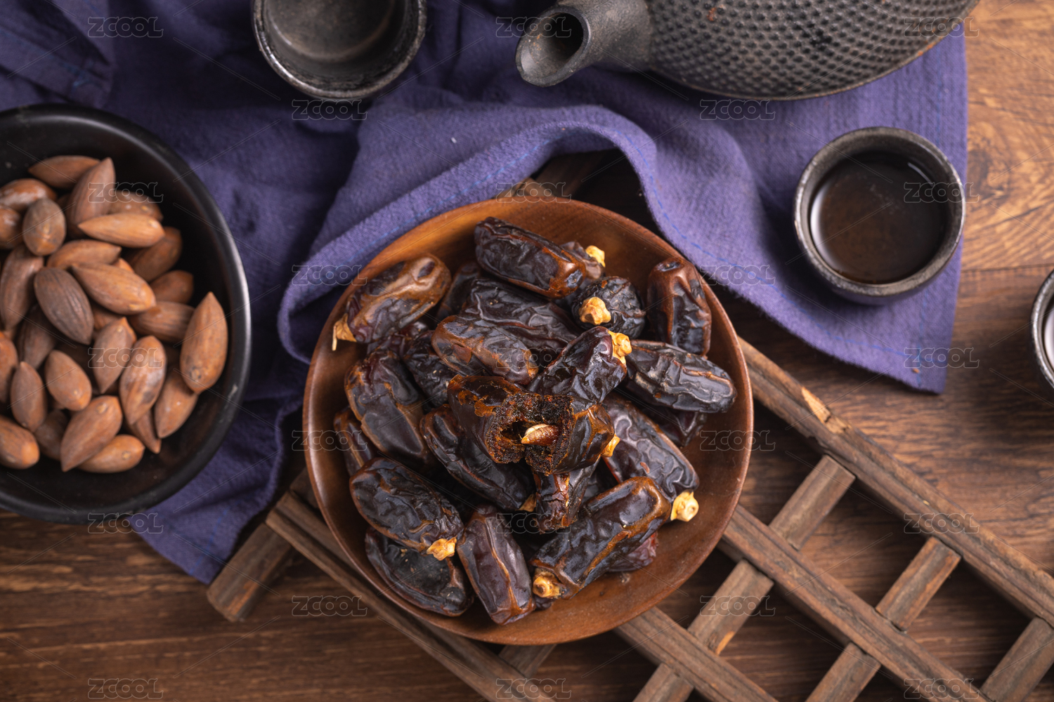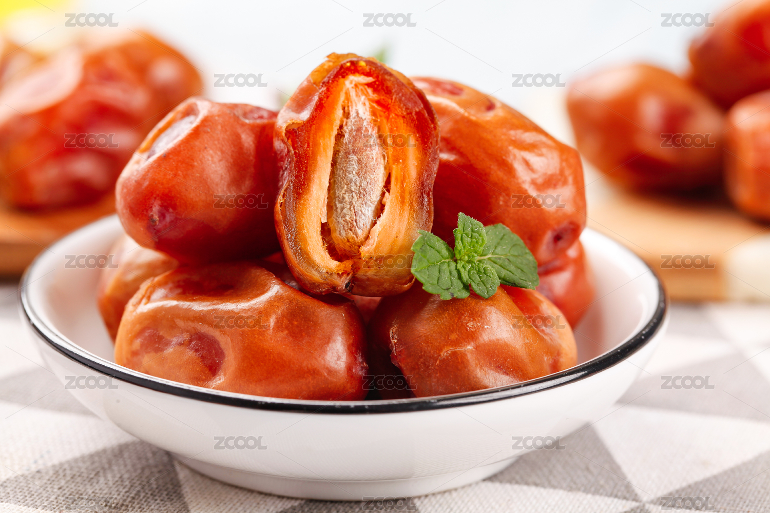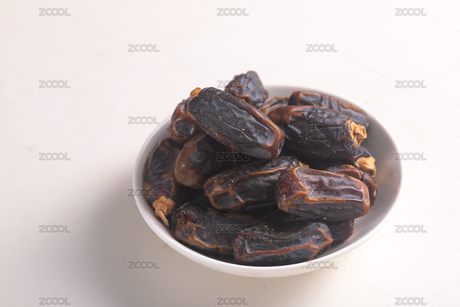 白底上黑石板上放著一堆黃椰棗和切開的椰棗