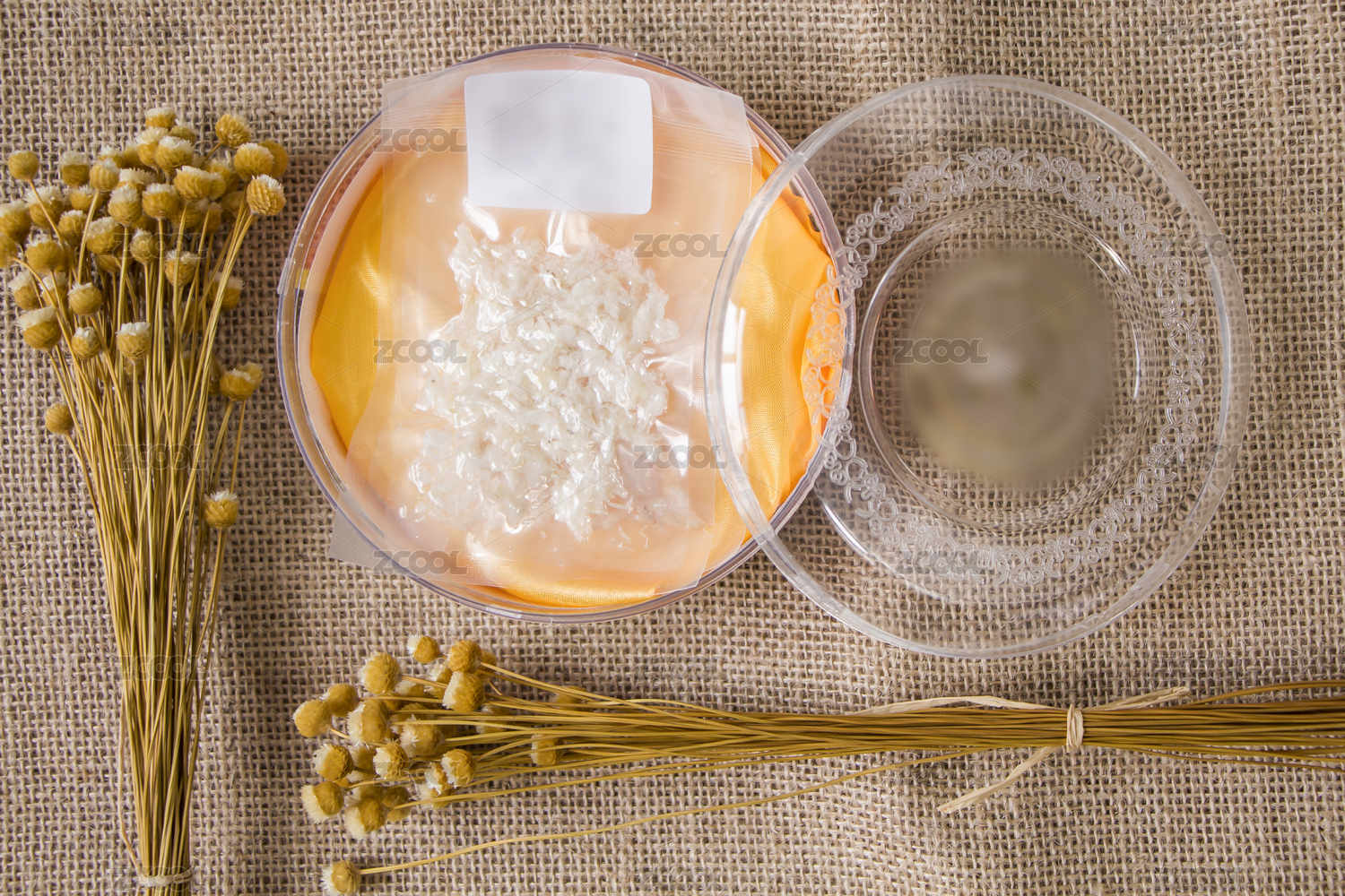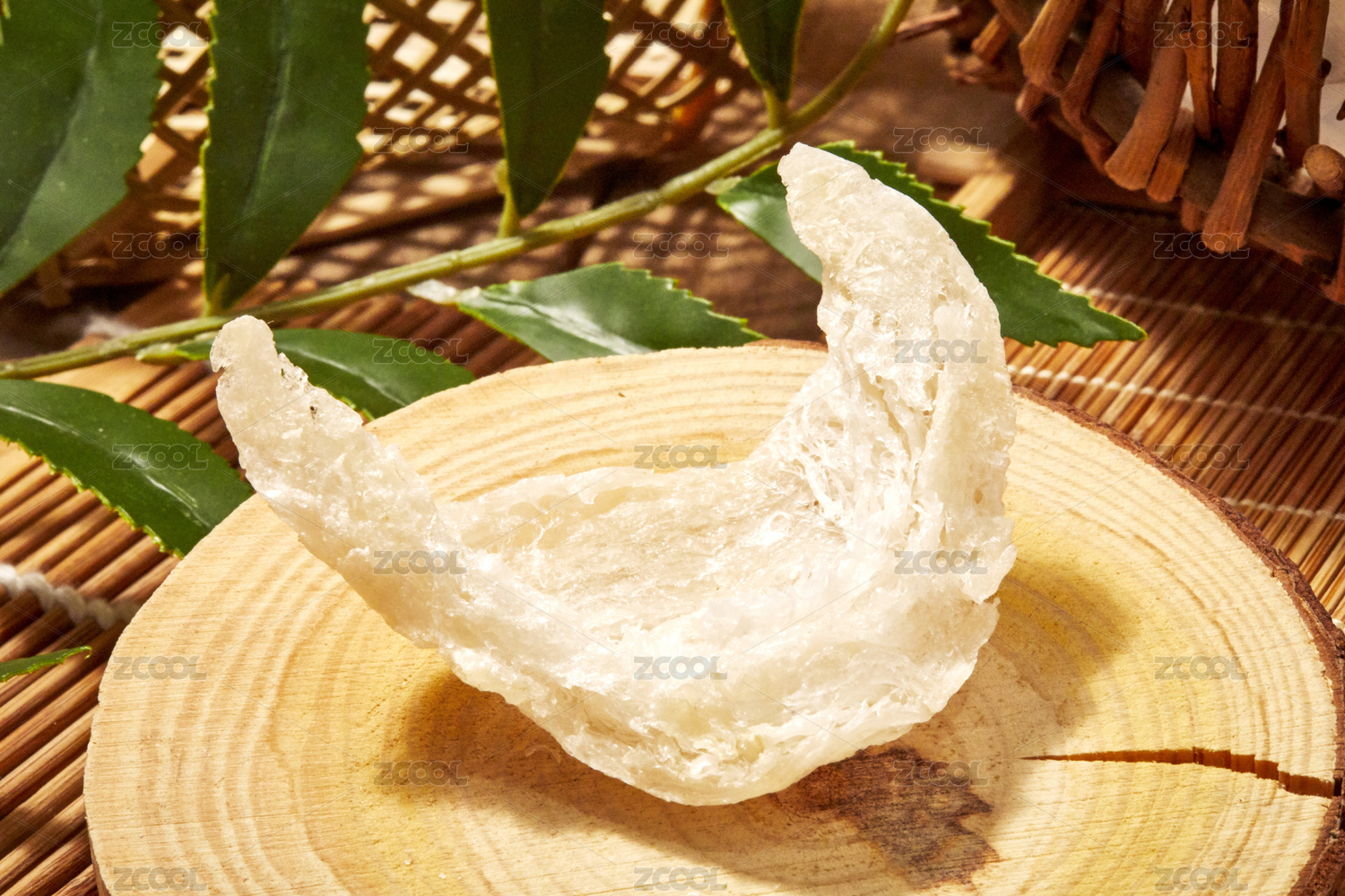 竹枝木質(zhì)背景木質(zhì)托盤上的泡發(fā)燕窩燕絲