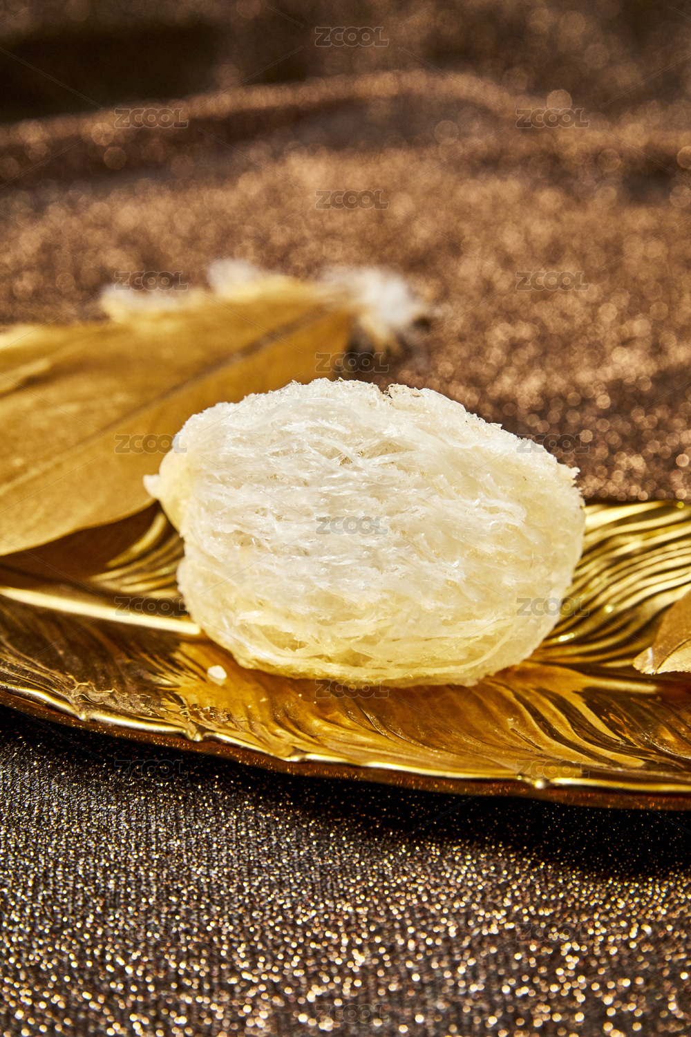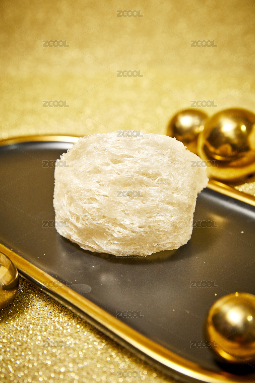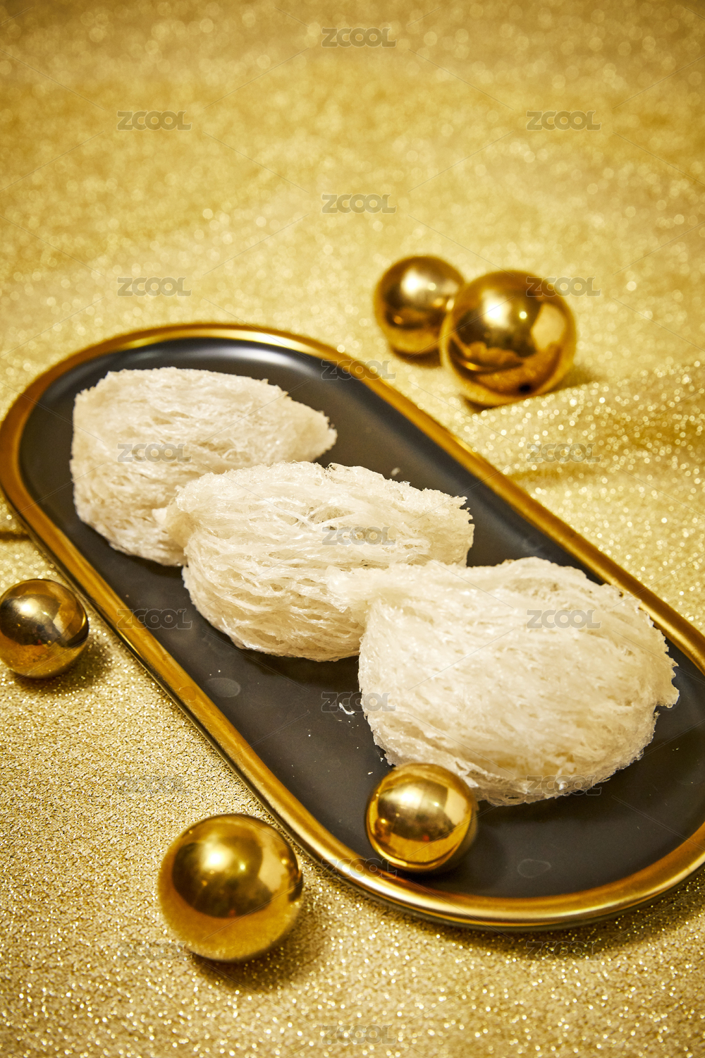 金色金砂背景金邊托盤上的燕窩特寫