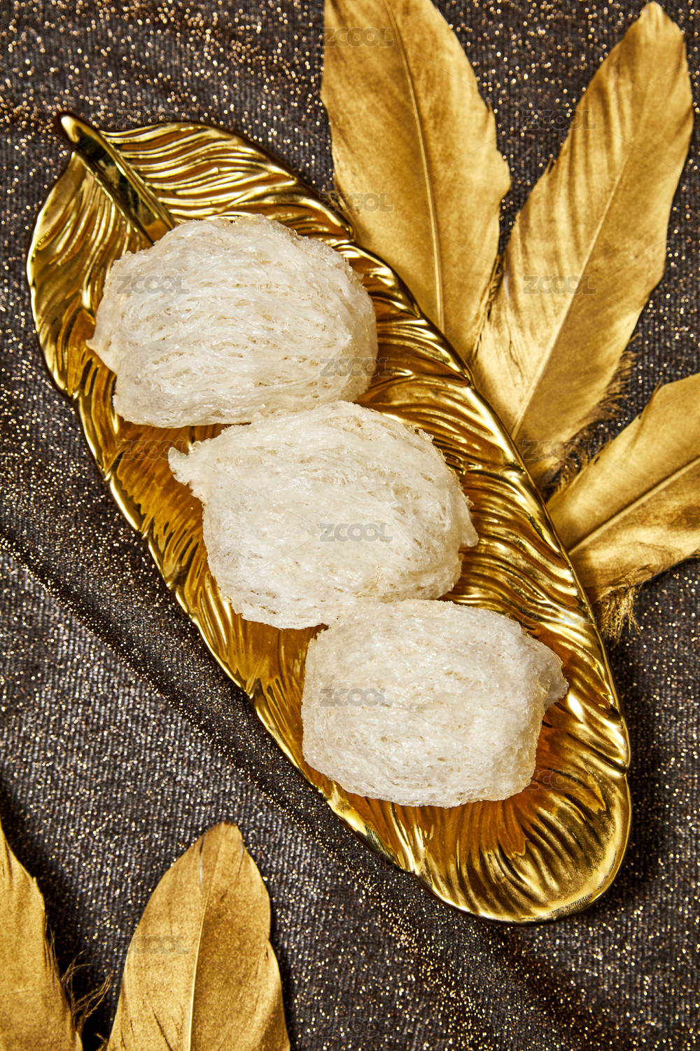金色羽毛與金色托盤上的燕窩燕盞