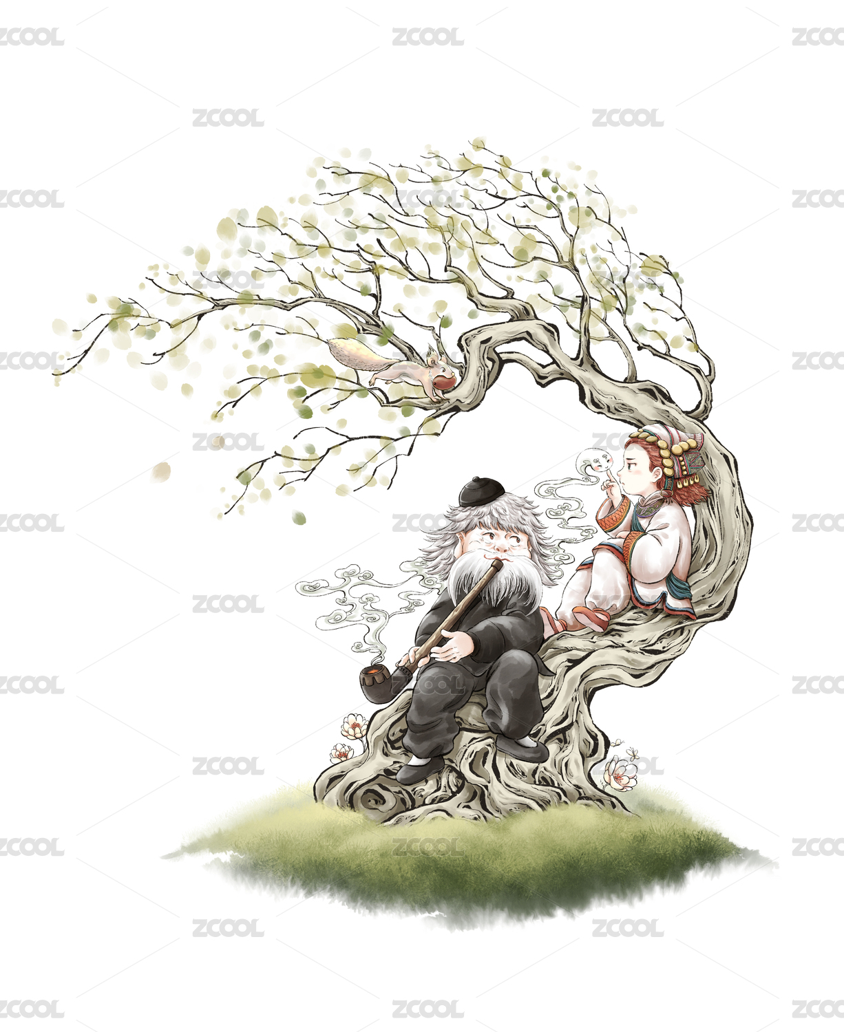 老人與少女樹下小憩