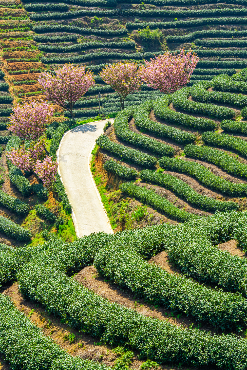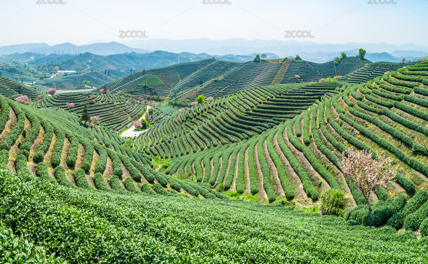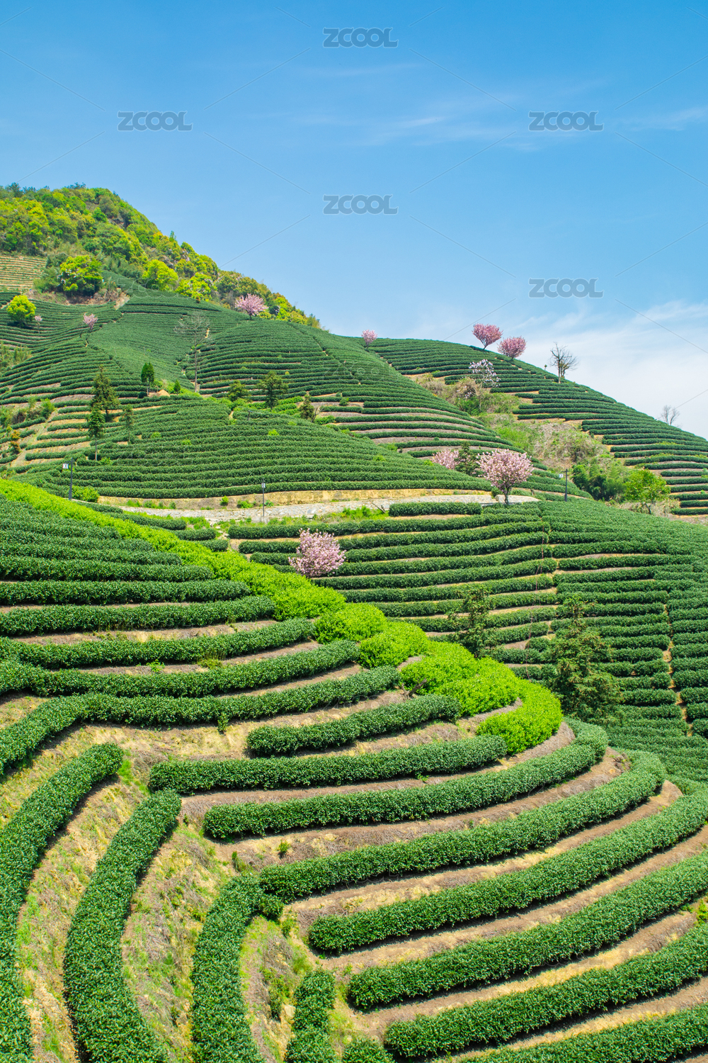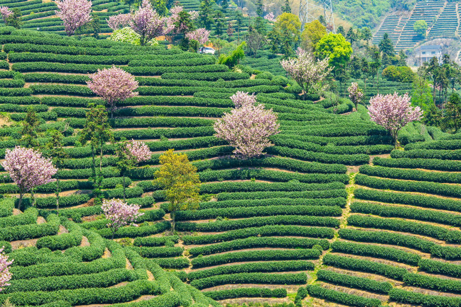 浙江杭州富陽梯田茶園與櫻花樹