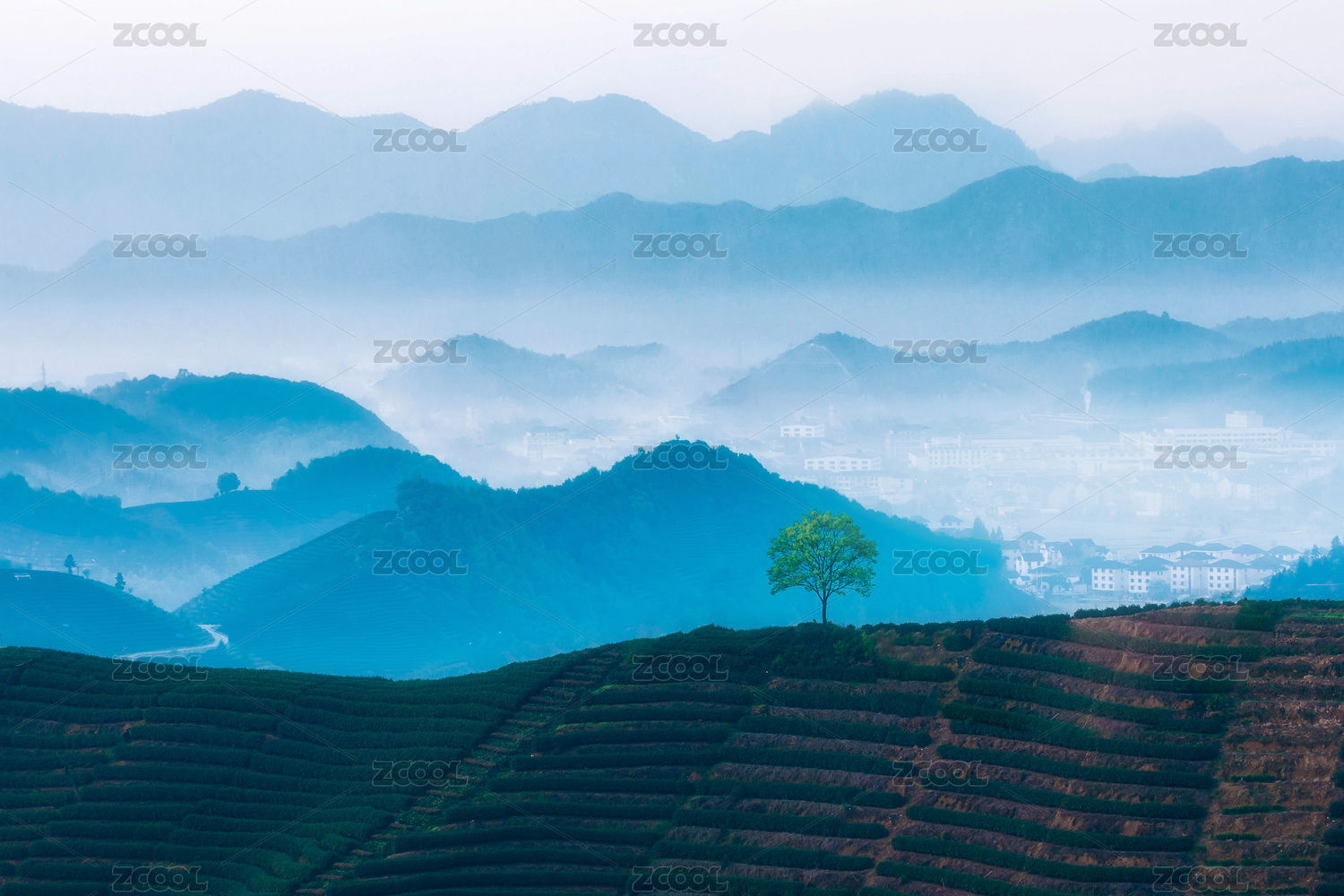 杭州富陽拔山茶園春天早晨晨霧