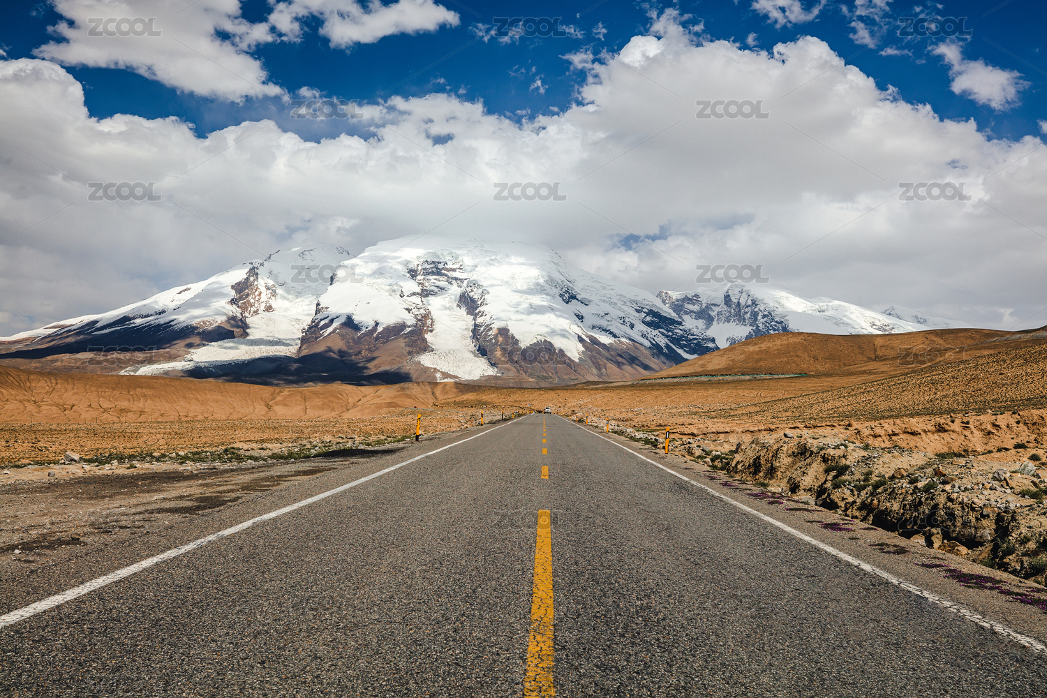 晴朗天氣藍(lán)天白云下在中國新疆喀什塔什庫爾干中巴友誼公路上眺望雪山