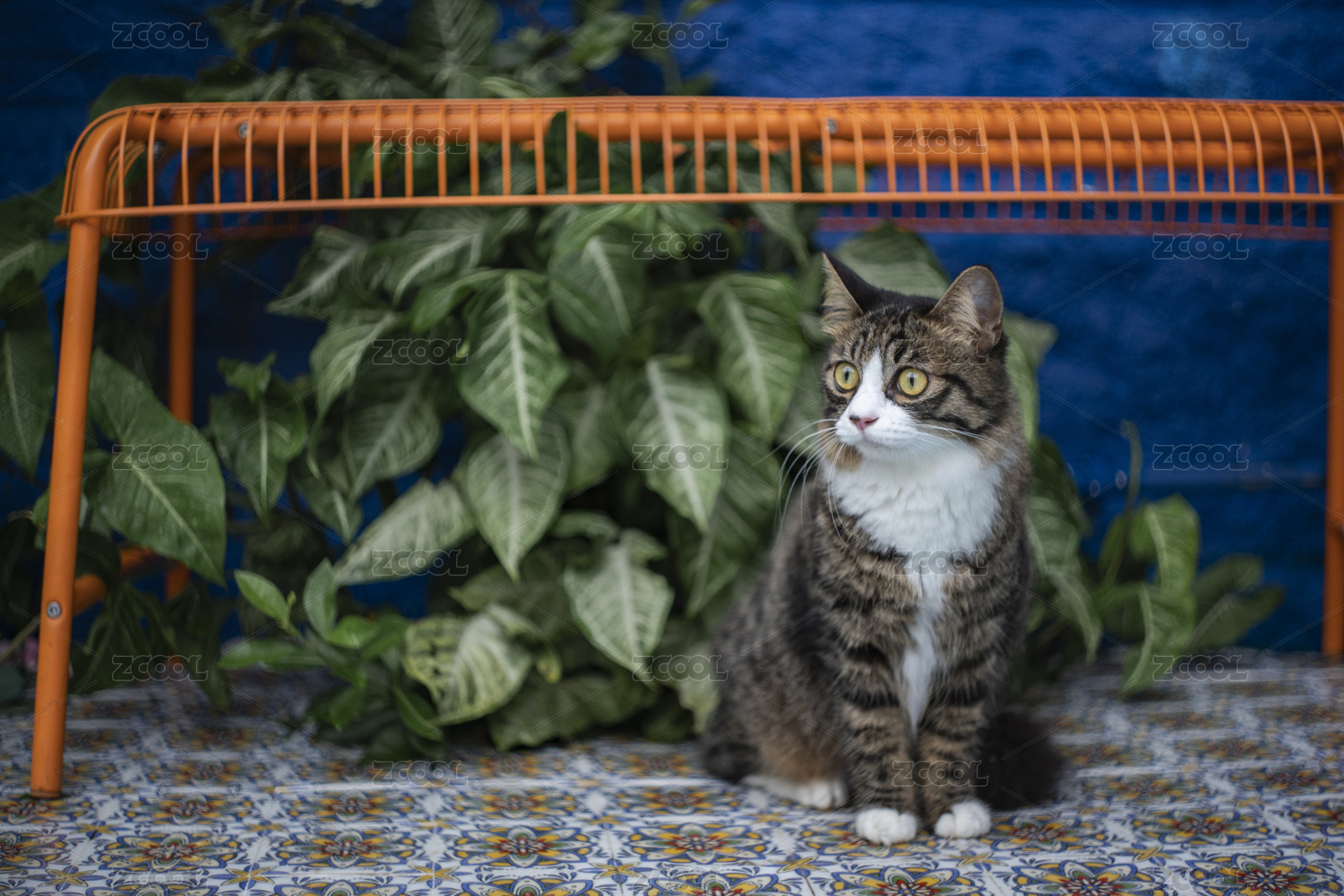 一只長毛貍花貓站在藍(lán)色墻和背景前面
