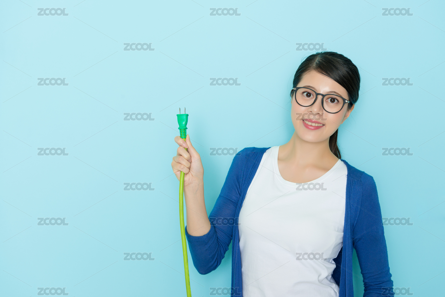微笑漂亮的女士臉在藍(lán)色墻背景照相機站立和保持表示節(jié)省電動概念插頭線設(shè)備。