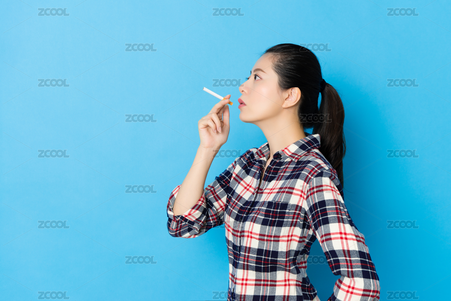 漂亮優(yōu)雅女模特保持香煙和隔絕在藍(lán)色墻背景制造吸煙姿勢的側(cè)視圖的照片。