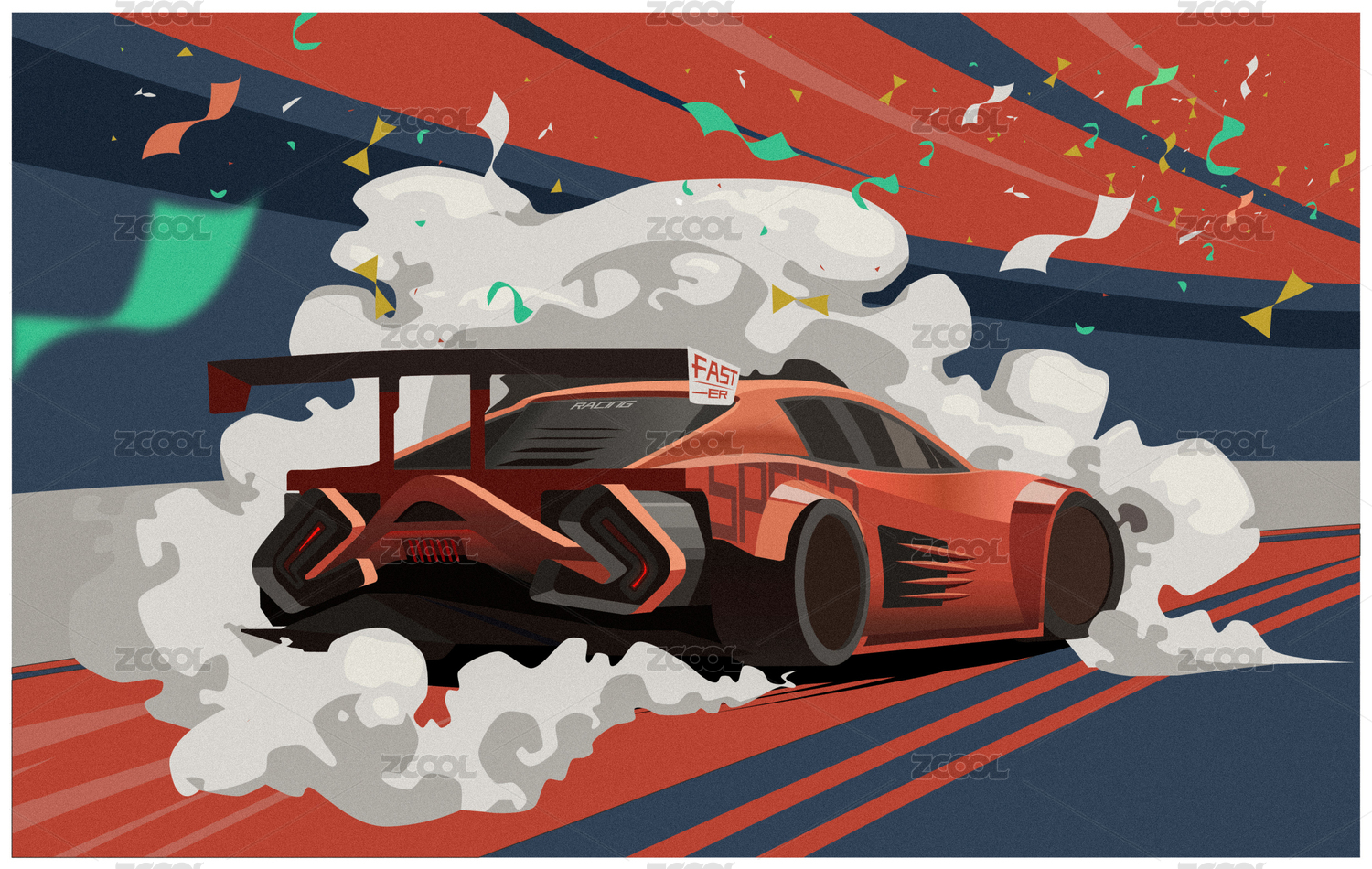 煙霧中的跑車在賽道上飛馳矢量插畫