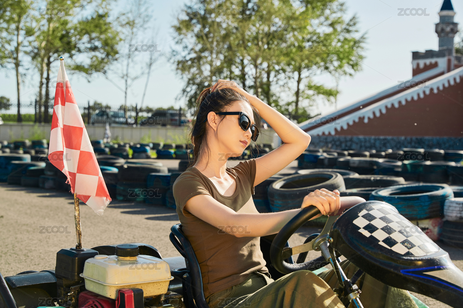 在游樂場卡丁賽道上駕駛卡丁車的美女