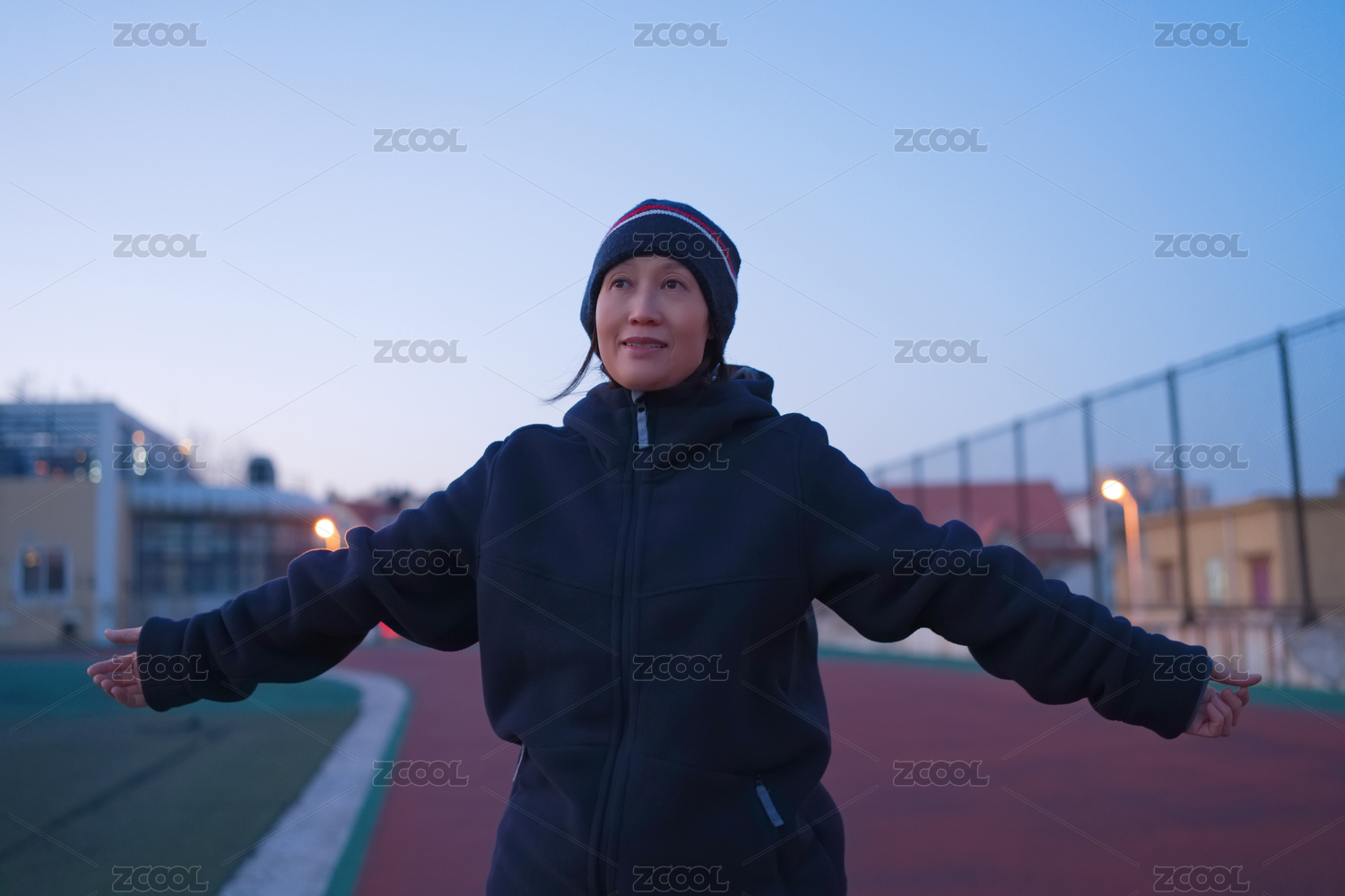 女人在黃昏時(shí)分在賽道上伸展手臂